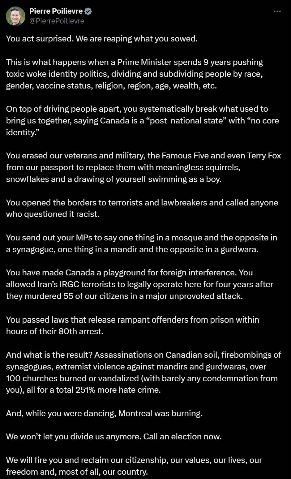 To this, opposition leader Pierre Poilievre responded: “You act surprised. We are reaping what you sowed. This is what happens when a Prime Minister spends 9 years pushing toxic woke identity politics, dividing and subdividing people by race, gender, vaccine status, religion, region, age, wealth, etc. On top of driving people apart, you systematically break what used to bring us together, saying Canada is a “post-national state” with “no core identity.” You erased our veterans and military, the Famous Five and even Terry Fox from our passport to replace them with meaningless squirrels, snowflakes and a drawing of yourself swimming as a boy. You opened the borders to terrorists and lawbreakers and called anyone who questioned it racist. You send out your MPs to say one thing in a mosque and the opposite in a synagogue, one thing in a mandir and the opposite in a gurdwara. You have made Canada a playground for foreign interference. You allowed Iran’s IRGC terrorists to legally operate here for four years after they murdered 55 of our citizens in a major unprovoked attack. You passed laws that release rampant offenders from prison within hours of their 80th arrest. And what is the result? Assassinations on Canadian soil, firebombings of synagogues, extremist violence against mandirs and gurdwaras, over 100 churches burned or vandalized (with barely any condemnation from you), all for a total 251% more hate crime. And, while you were dancing, Montreal was burning. We won’t let you divide us anymore. Call an election now. We will fire you and reclaim our citizenship, our values, our lives, our freedom and, most of all, our country.”