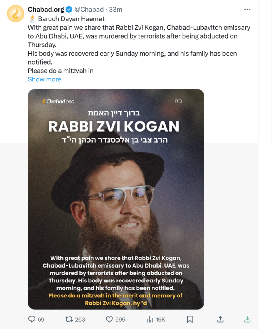 “This murder was carried out in the UAE. The murder of an Israeli citizen and a Chabad shaliach is an abhorrent antisemitic terrorist attack. On your behalf, I also send heartfelt condolences to the Kogan family. The State of Israel will use all means and will deal with these murderers, and those who dispatched them, to the fullest extent of the law. None of them will escape.”