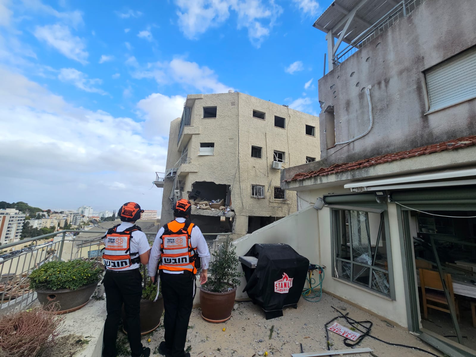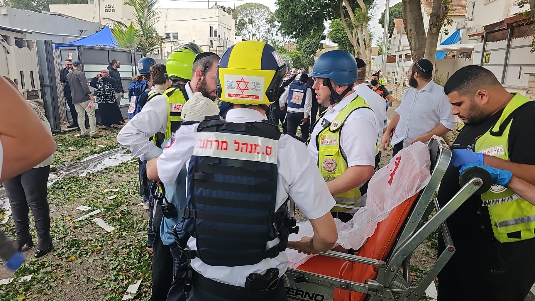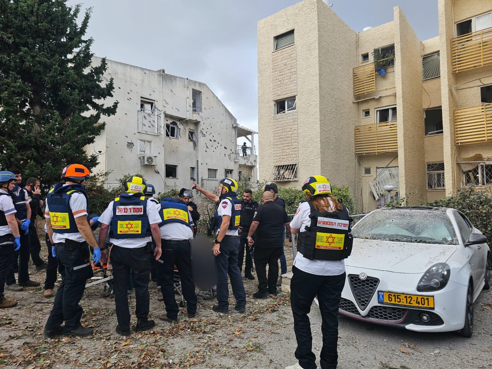 MDA EMTs and Paramedics are treating and evacuating 3 casualties to Bnei Tzion and Rambam Hospitals: males aged 56 and 54 in mild condition with shrapnel injuries, and 1 anxiety victim.