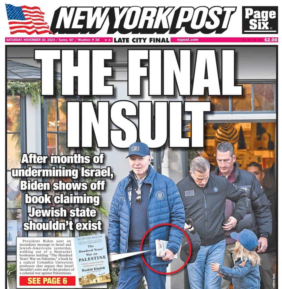 During a Black Friday shopping trip with his grandson Beau and family, outgoing President Joe Biden drew attention after being spotted carrying a book critical of Israel. The book, The Hundred Years’ War on Palestine: A History of Settler Colonial Conquest and Resistance, 1917-2017, by Columbia professor emeritus Rashid Khalidi, critiques the Zionist movement as “settler colonialism” and describes Palestinian oppression as “the oppression of one people by another.”