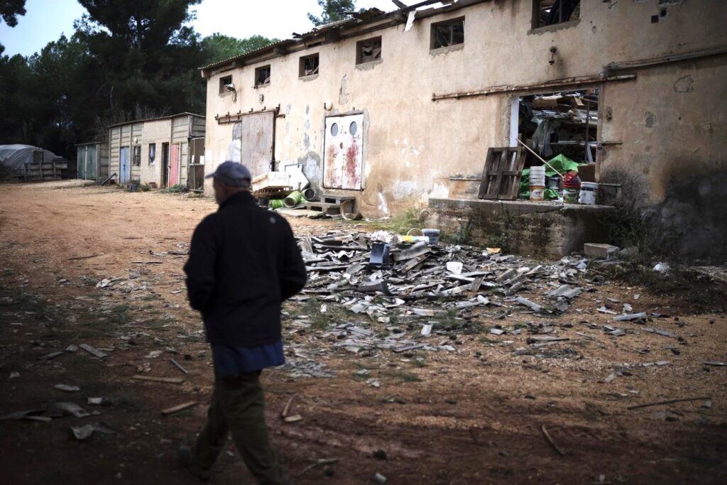 In the kibbutz’s communal kitchen and dining hall, ceiling beams have collapsed. The uprooted floorboards are covered with ash from fires that also claimed much of the kibbutz’s cropland.