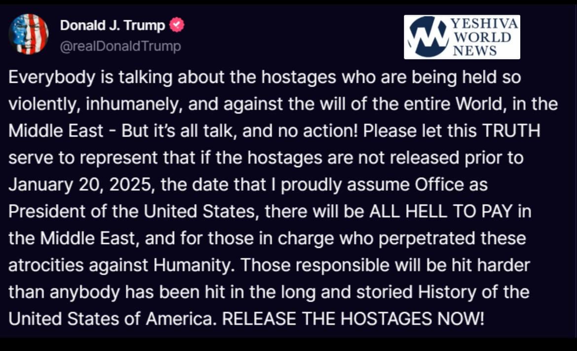 Lots of talk. What exactly is Trump threatening? He already said that the war must end before January 20th. Perhaps he will put tariffs on Gaza imports.