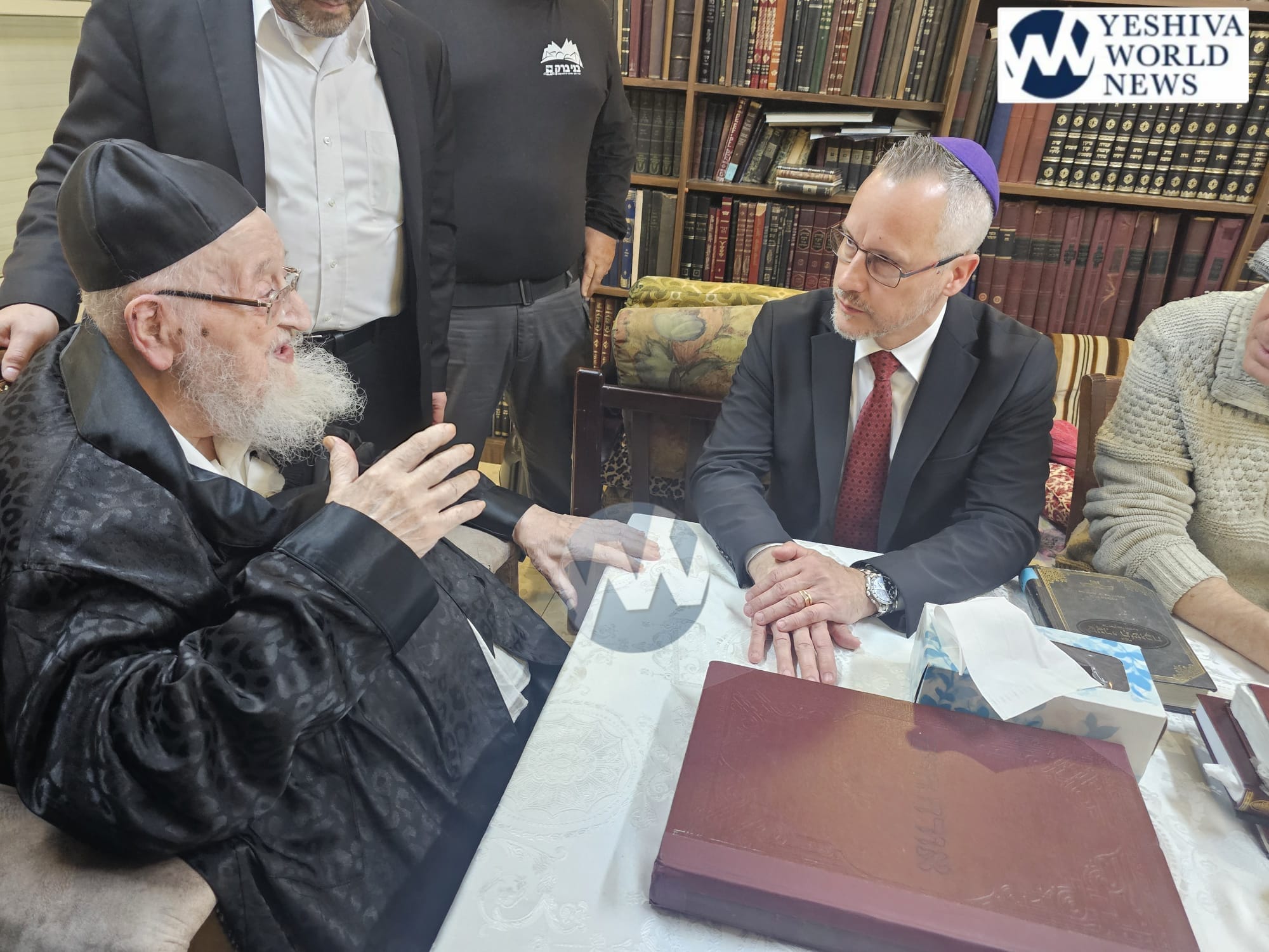 The ambassador met with HaRav Moshe Hillel Hirsch and HaRav Meir Tzvi Bergman at their homes – conversing with both in English (see video below). During his meeting with Rav Moshe Hillel Hirsch, Rosh Yeshiva of Slabodka, Geissbühler gained insight into the values and principles that guide bnei Torah including their refusal to join the IDF. Later, he spent time with HaRav Meir Tzvi Bergman, witnessing the revered rosh yeshiva light the Chanukah menorah. Notably, this encounter took place just hours before the passing of Rav Bergman’s wife, Rebbetzin Devorah Bergman, who was niftar at 97 on the night of Zos Chanukah.