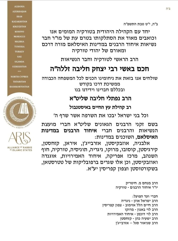 The niftar, who served on the presidential board of the Alliance of Rabbanim in Islamic States [ARIS), was born in Istanbul. As a bochur, he studied at a Jewish high school in Beyoğlu, served in the Turkish army, and then traveled to Eretz Yisrael to learn at the famed Yeshivat Porat Yosef, where he learned under HaGaon HaRav Ovadia Yosef, z’tl, and HaGaon Harav Shimon Baadani, z’tl.
