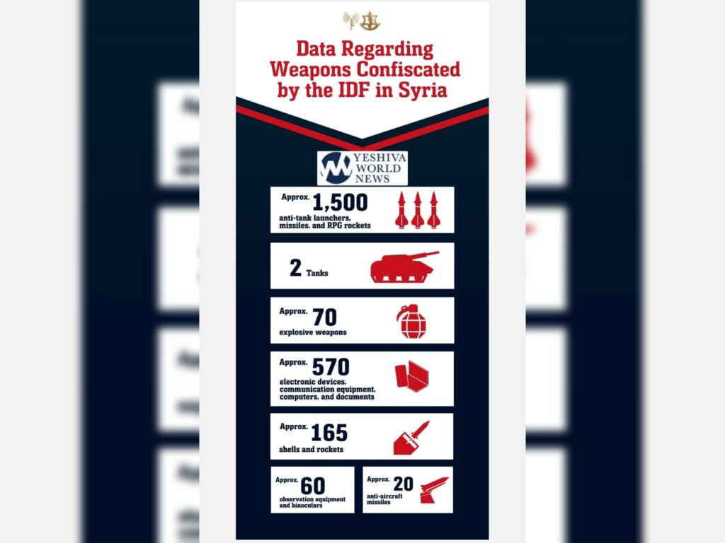 The IDF on Wednesday announced that its troops have confiscated more than 3,300 weapons and enemy assets from Syrian territory as part of ongoing efforts to secure Israel’s northern border. The operation is spearheaded by the 210th Division, which is tasked with defending the Golan Heights and safeguarding Israeli residents in the area.
