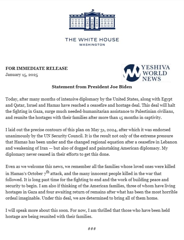 2:00PM ET: President Biden releases statement on Israel Hamas ceasefire agreement