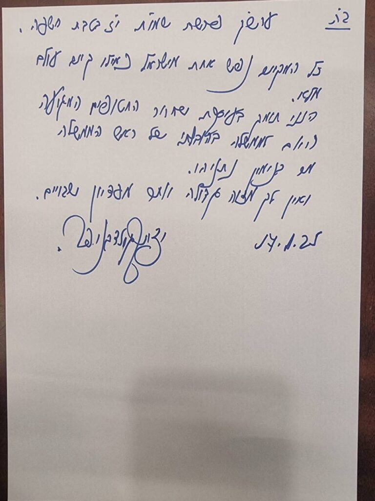 Housing Minister Yitzhak Goldknopf wrote in a note he left: “Whoever saves one soul of Israel – it is as if he has saved an entire world. I support the hostage release deal that that the government of Prime Minister Binyamin Netanyahu is finalizing today. And there is no greater mitzvah than pidyon shevuim.”