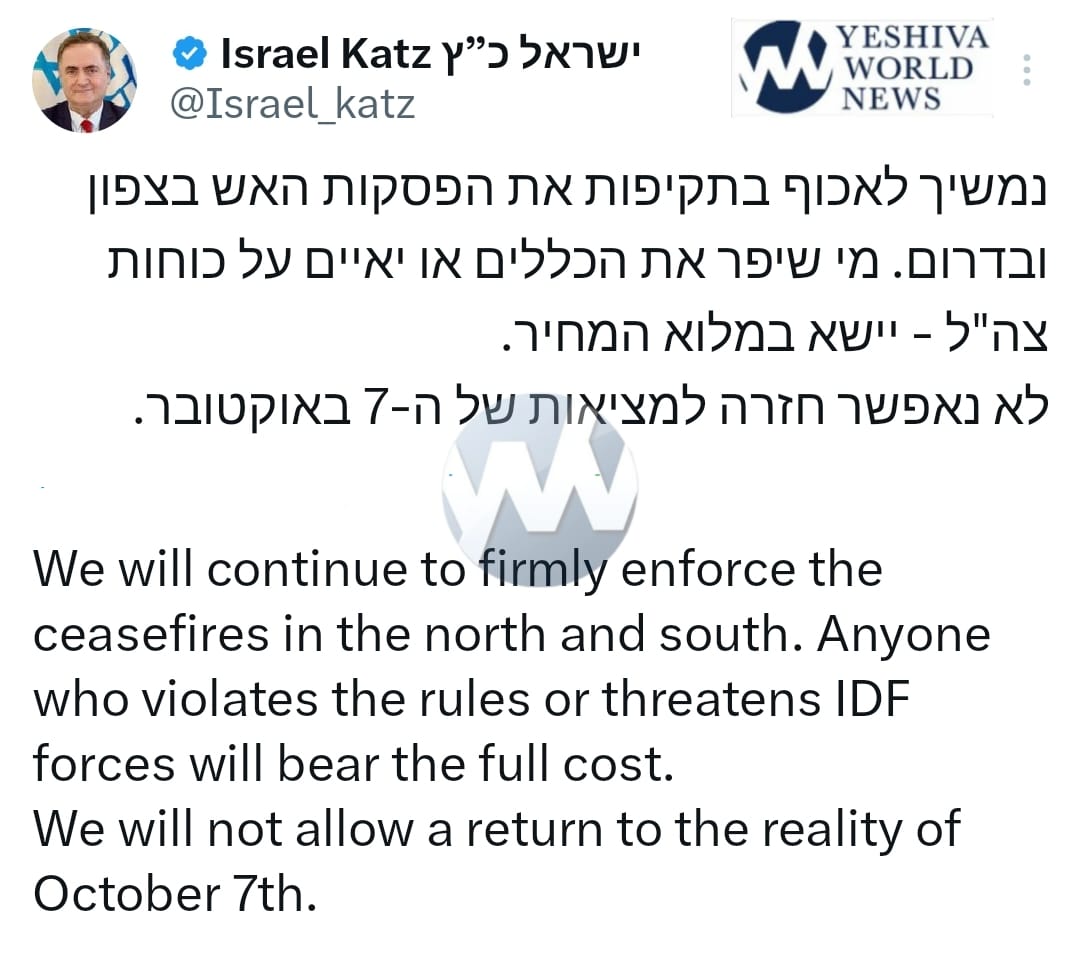 Defense Minister Yisrael Katz affirmed Israel’s commitment to enforcing the ceasefire, stating, “We will firmly enforce the truce across all of Gaza, ensuring the agreement’s terms are upheld.”