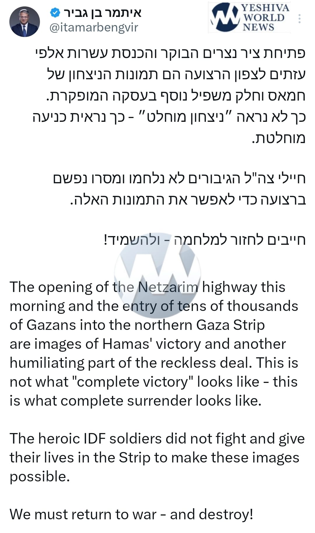 Meanwhile, as expected, Itamar Ben-Gvir expressed outrage at the scenes of Gazans returning north. In a post on X, he slammed the ceasefire agreement, stating, “This is not what ‘complete victory’ looks like — this is what complete surrender looks like… Heroic IDF soldiers did not fight and give their lives in the Strip only for Palestinians to return north and make these images possible. We must return to war — and destroy!”