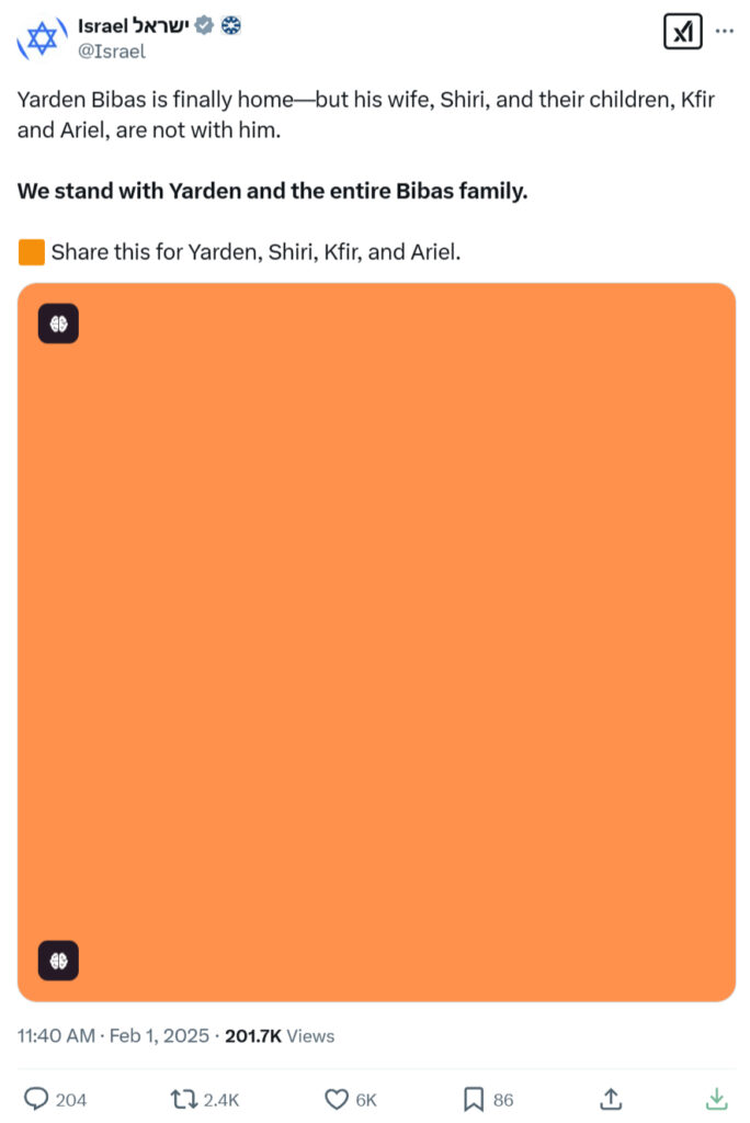 Yarden Bibas, who returned from captivity on Shabbos, cannot fully rejoice as he returned without his wife Shiri, and two children Ariel and Kfir.