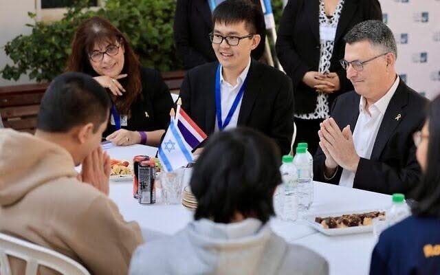 Foreign Minister Gideon Sa’ar visited the released Thai hostages at Shamir Medical Center on Friday, the day after their release. (Oz Schechter/GPO)