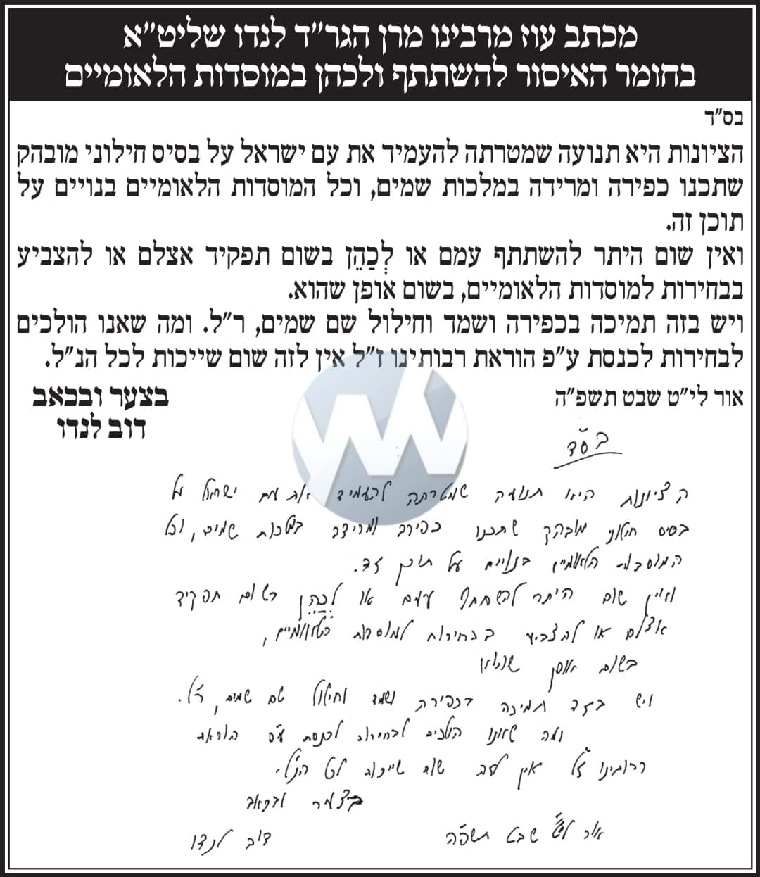 The letter states “The Zionist movement exists solely to uproot Klal Yisrael from its Torah’dige foundation, built on kefirah and meridah b’Malchus Shamayim. All of its institutions are steeped in this foundation. There is no heter whatsoever to participate with them, hold any position within them, or vote in their elections.”