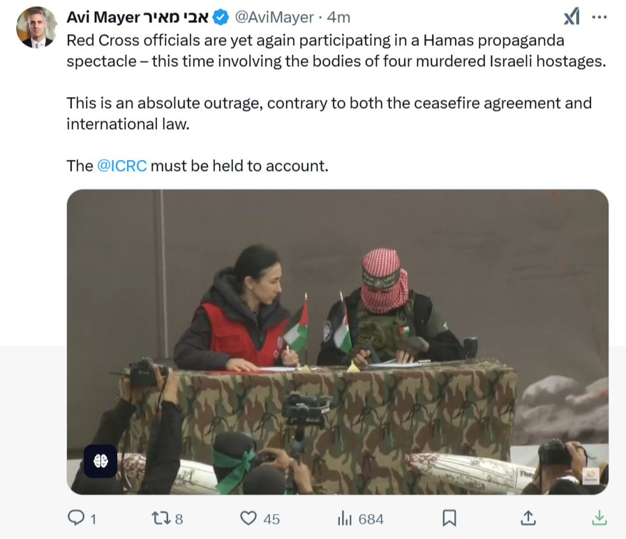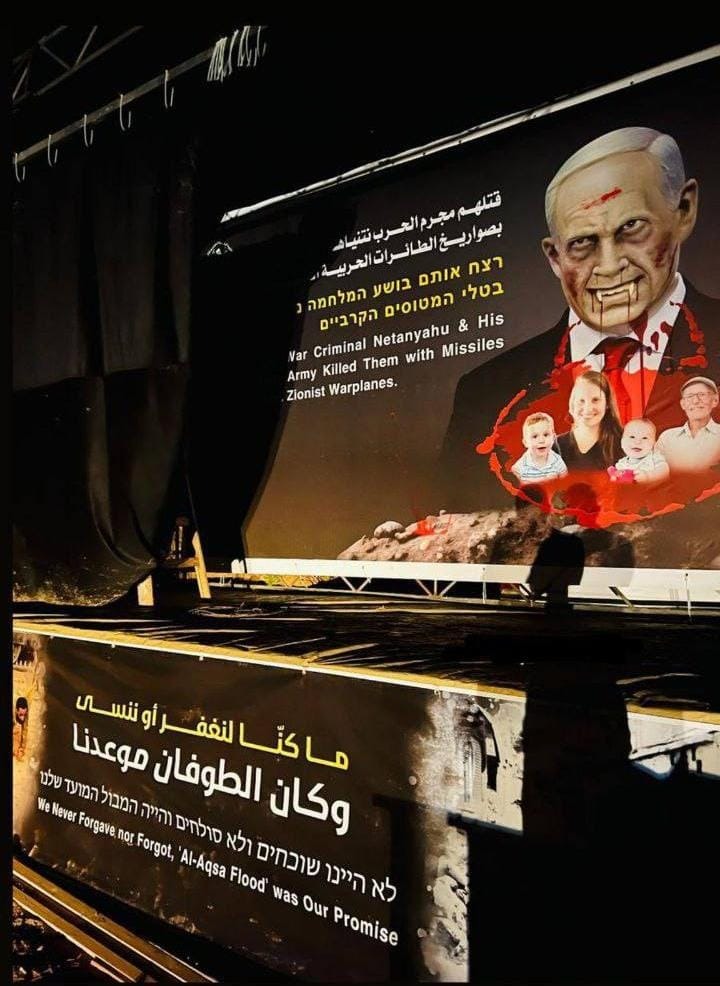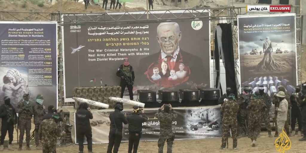 Earlier, the terror group built a stage featuring a banner depicting Prime Minister Binyamin Netanyahu as a vampire delighting over the “murder” of the hostages, with images of Shiri, Ariel and Kfir Bibas and Oded Lifshitz. The banner stated in Arabic, Hebrew, and English: “War Criminal Netanyahu and His Army Killed Them With Missiles and Zionist Warplanes.”