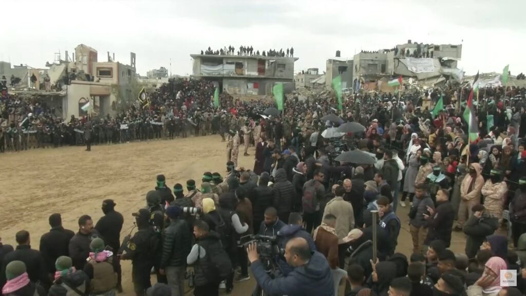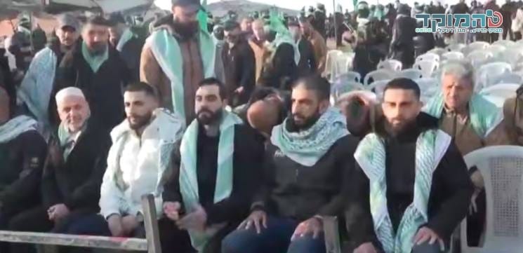 According to Kan News reporter Roi Kais, terrorists released from Israeli prisons in previous hostage release waves, were among the audience.