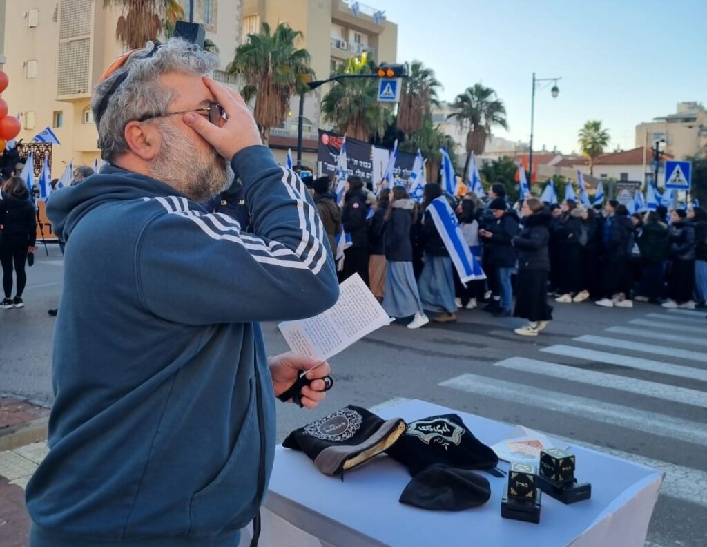 Thousands of Israelis wrapped tefillin on Wednesday l’illui nishmas the Bibas family at special booths set up before the levaya by Chabad shlichim.