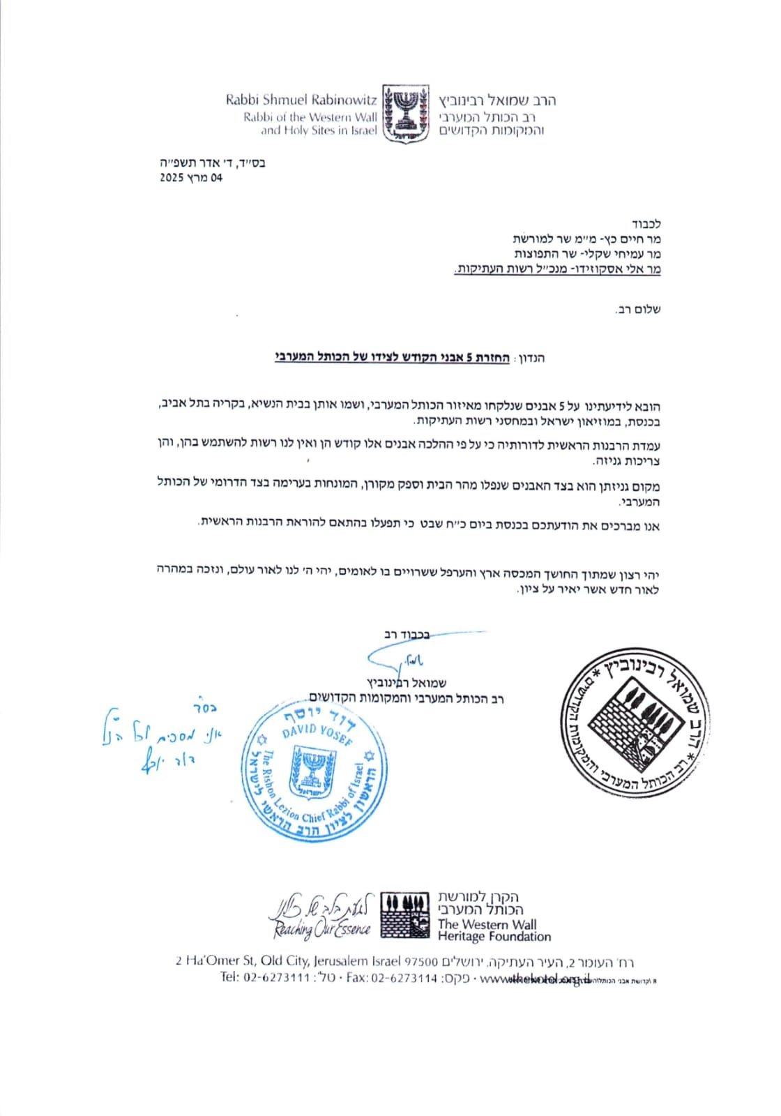 The Chief Rabbanim of Israel and the Kosel Rav are demanding the return of five fallen Kosel stones currently on display at various places in Israel.