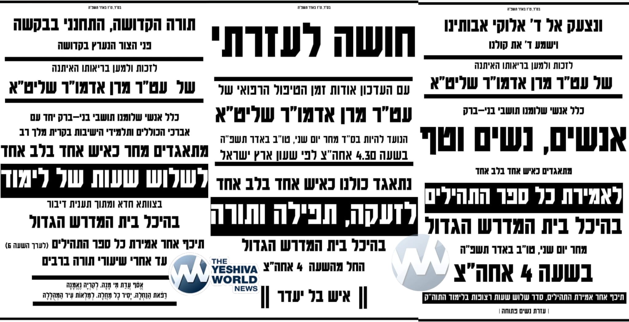On Monday, there will be a Yom Tefillah in Vishnitz. Numerous announcements have bene hung in Vishnitzer Bateri Midrashim around the world, calling on everyone to join in Tefillah and Limud Hatorah.