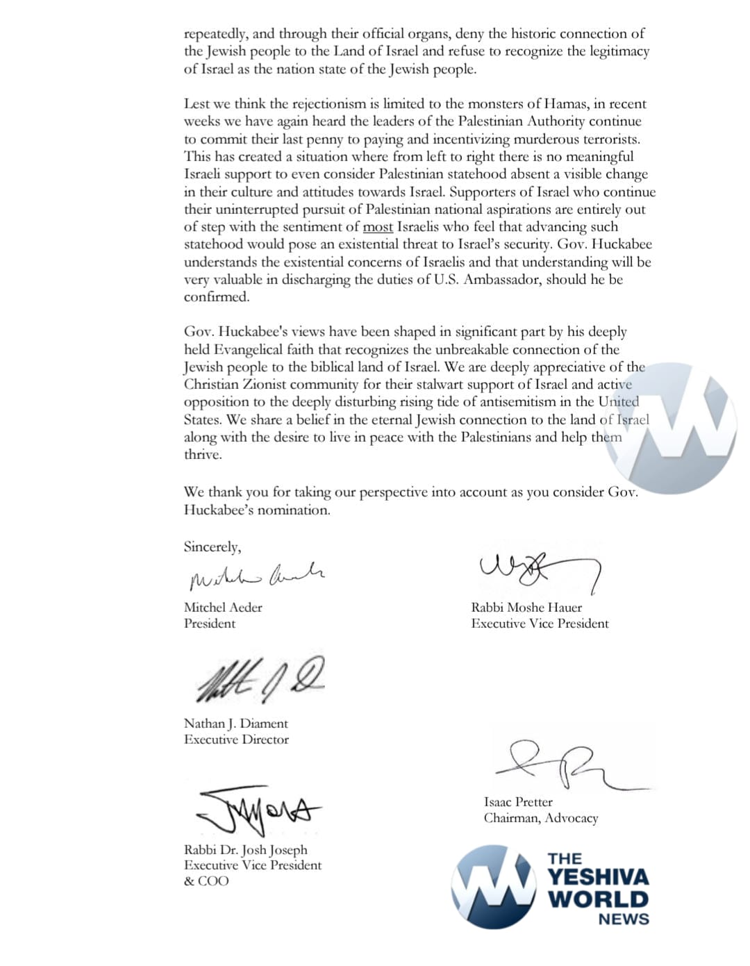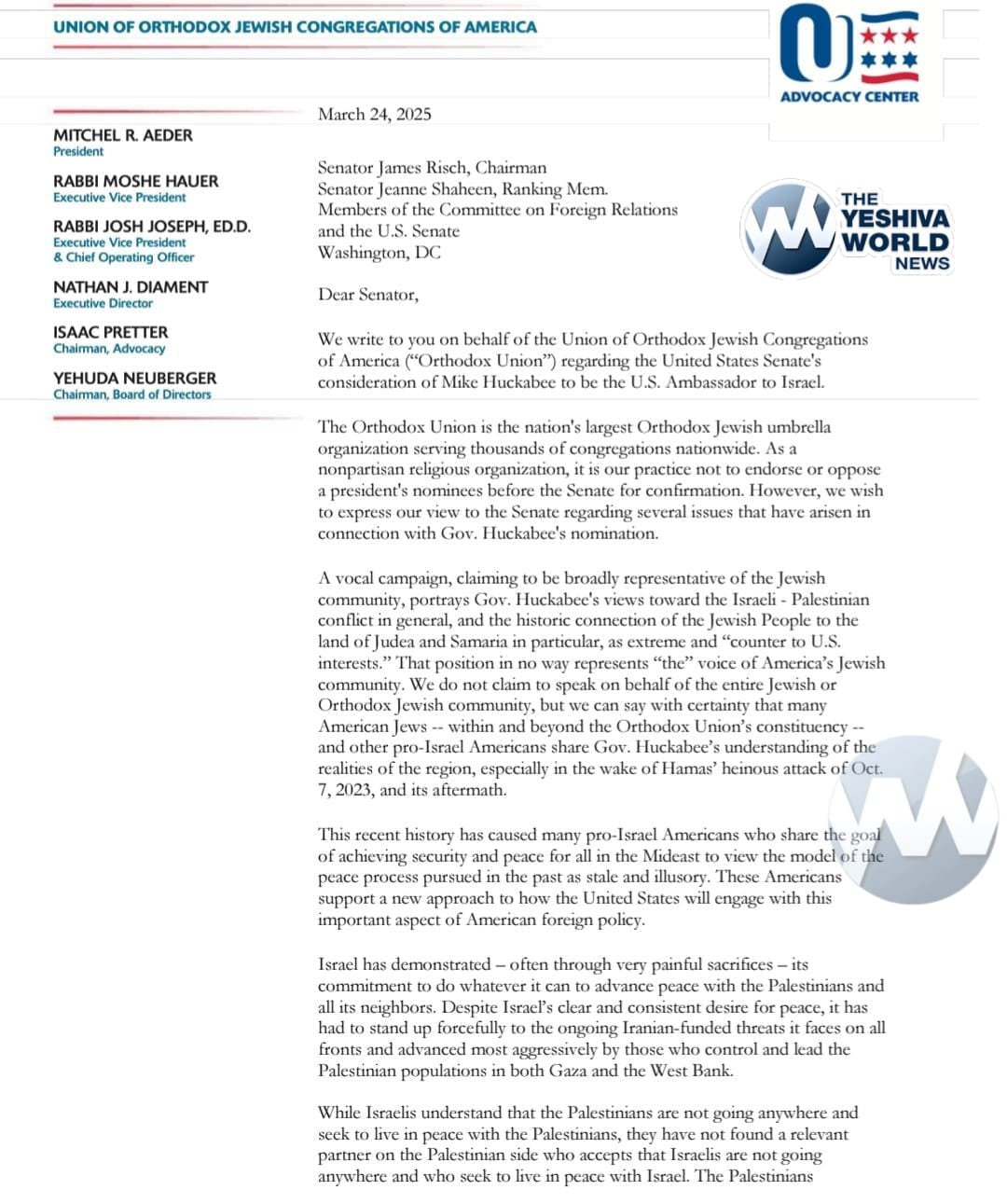 The Orthodox Union Advocacy Center (OUA), the public policy arm of the Union of Orthodox Jewish Congregations of America, submitted a letter this morning urging the Senate Foreign Relations Committee to confirm Governor Mike Huckabee’s nomination as U.S. Ambassador to Israel.
