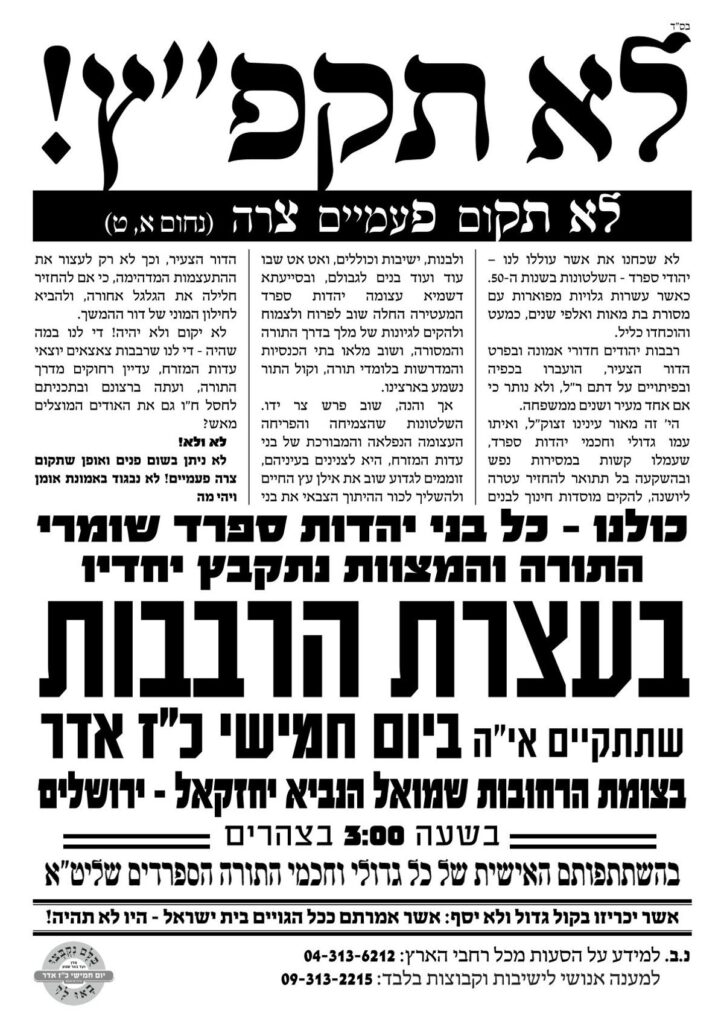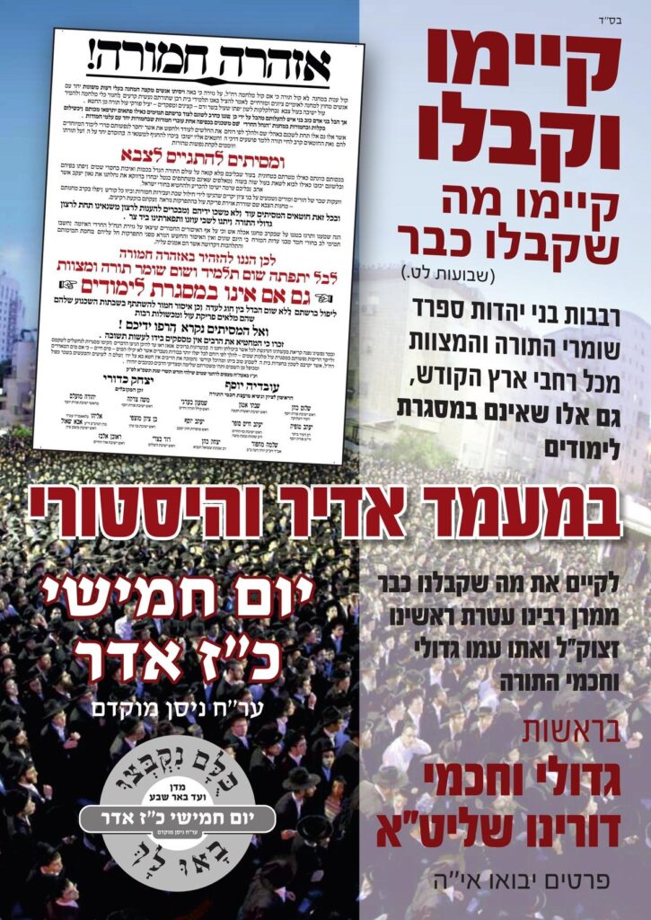 One of the advertisements for the atzeres, titled “לא תקום פעמיים צרה” reminded the Sephardi sector about the hundreds of thousands of Sephardi Jews who were cut off from Torah and mitvos after moving to Israel in the 1950s. “But then, with the great mesirus nefesh of Sephardi Gedolim and Chachamim, who established mosdos chinuch, shuls, yeshivos, and kollelim, the Sephardi Olam HaTorah slowly grew and flourished once again.”