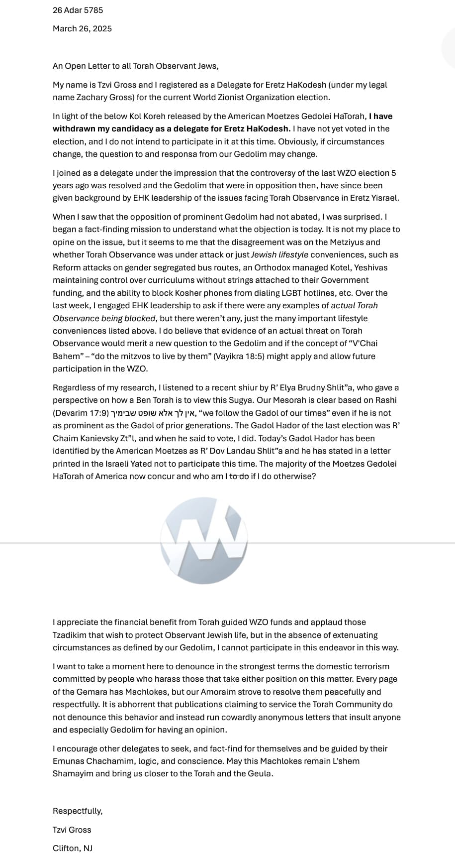 My name is Tzvi Gross and I registered as a Delegate for Eretz HaKodesh (under my legal name Zachary Gross) for the current World Zionist Organization election.