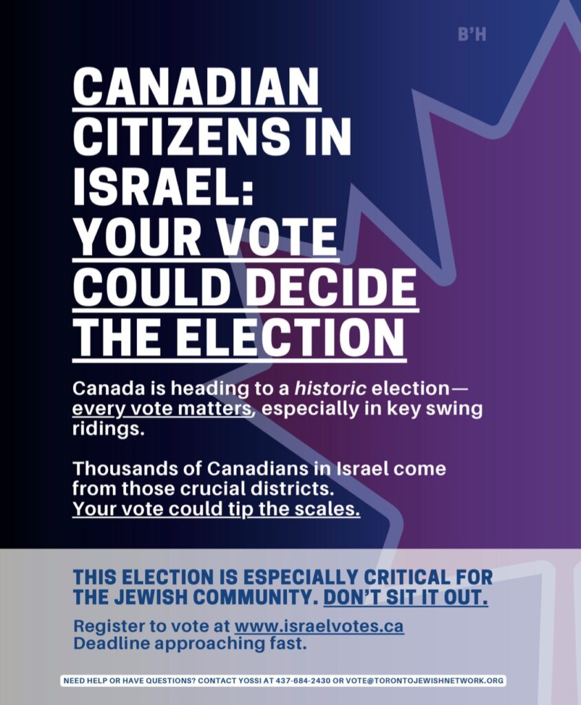 Among those who could play a decisive role in the election are Canadian citizens residing in Israel. Chaim V’Chessed has learned that many of these Canadians hail from some of the most hotly contested electoral districts, making their votes particularly impactful. As a result, eligible Canadian voters living in Israel are being strongly encouraged to participate in the election. With various policies and political shifts at stake, Jewish leaders and organizations have emphasized the need for community members to exercise their democratic rights.