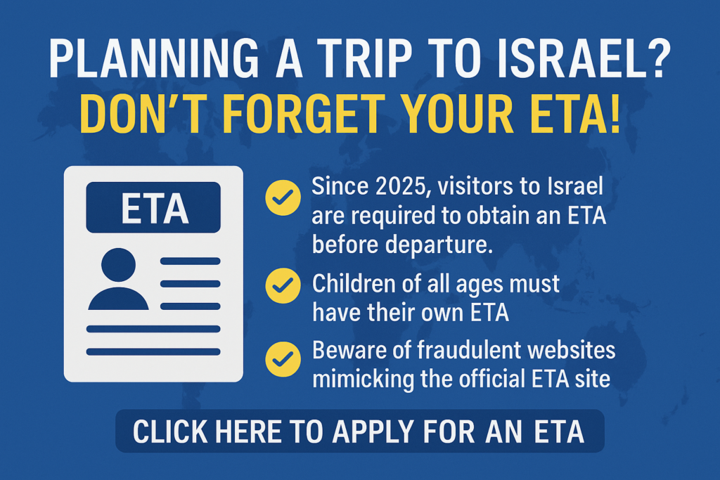 As previously reported by Chaim V’Chessed, a significant travel update took effect at the start of 2025: all travelers to Israel are now required to complete an Electronic Travel Authorization (ETA) before departure. Without an approved ETA, airlines will not permit passengers to board flights to Israel—with the exception of Israeli passport holders. Even Israeli citizens need an ETA – if traveling on a foreign passport.