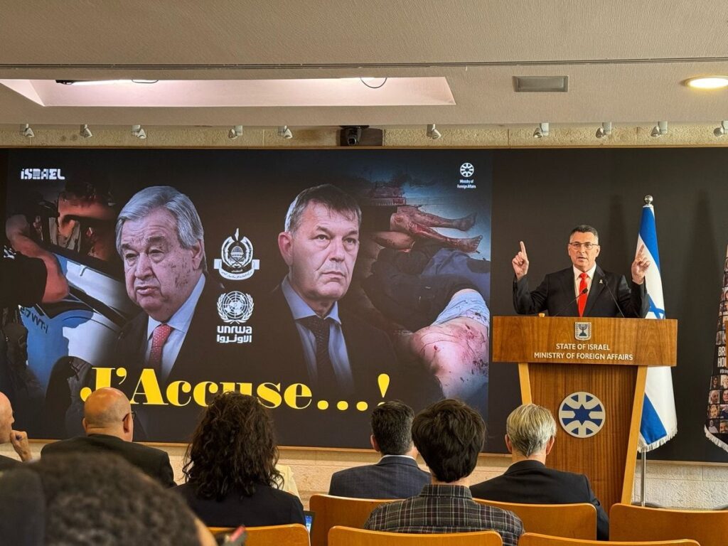 “I accuse,” Sa’ar said: “I accuse UNRWA. I accuse the UN. I accuse the Secretary-General. I accuse all those who weaponize international law and its institutions in order to deprive the most attacked country in the world — Israel — of its most basic right to defend itself.”