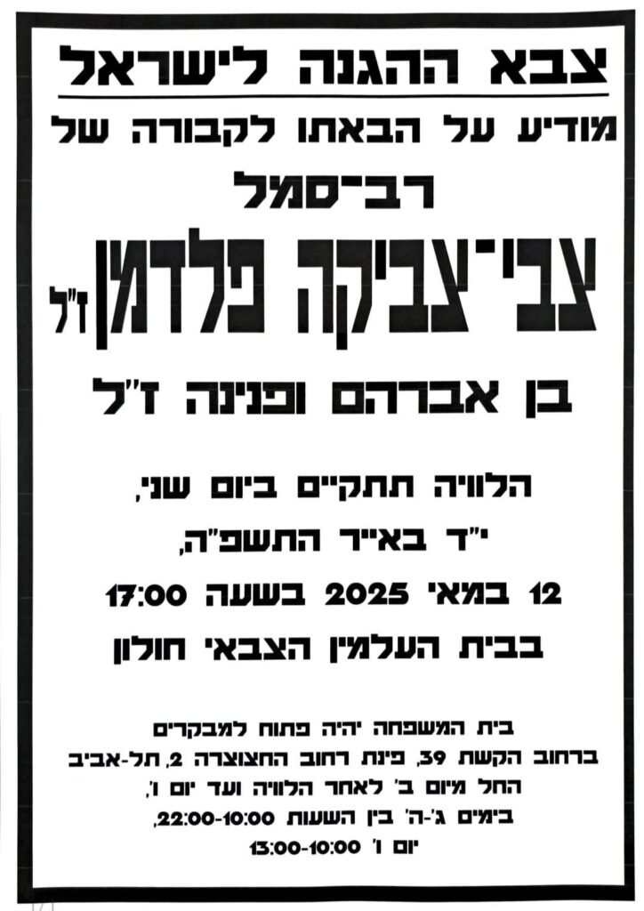 The body of Sgt. First Class Tzvi Feldman, H’yd, who fell in battle at Sultan Yacoub in June 1982, during the first Lebanon War, was returned in a special operation by the Mossad and IDF.