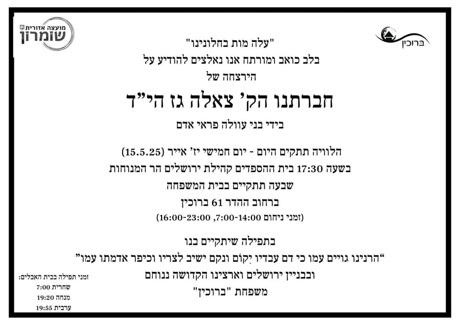 The levaya is scheduled for 5:30 p.m. at Har Hamenuchos in Jerusalem.