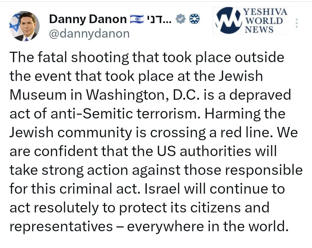 “Two staff members of the Israeli embassy were shot this evening at close range while attending a Jewish event at the Capital Jewish Museum in Washington DC.
