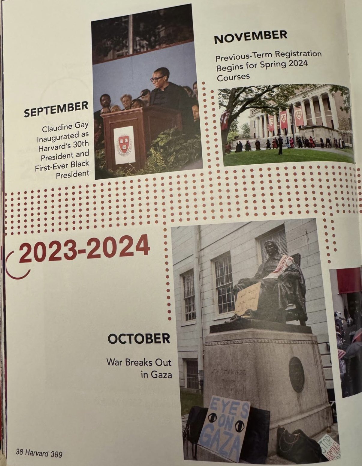 The yearbook page, appearing under the “Special Events” section on page 38, features a photo of a campus statue surrounded by anti-Israel protest paraphernalia alongside the caption: “October 2023: War Breaks Out in Gaza.” The description omits any mention of the Hamas-led assault that killed 1,200 Israeli civilians and soldiers and saw over 250 people, including 12 Americans, taken hostage. The attack has been widely recognized as the largest terror attack in Israel’s history and the deadliest attack targeting Jews since the Holocaust.