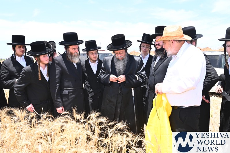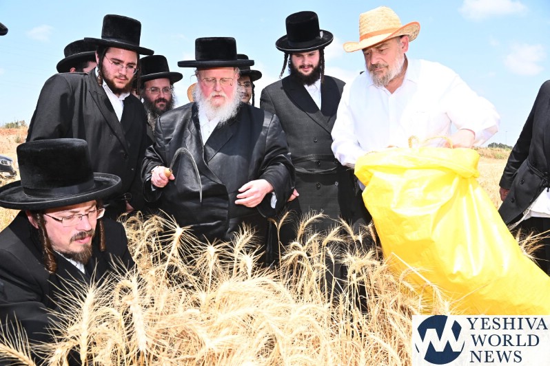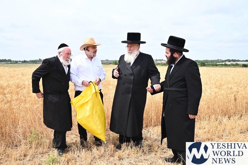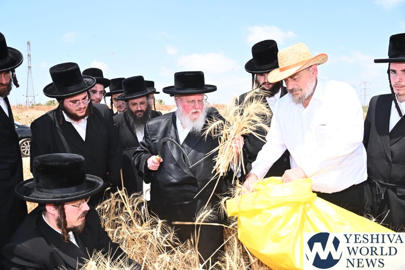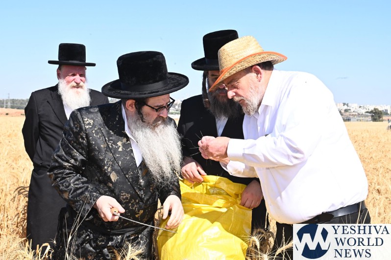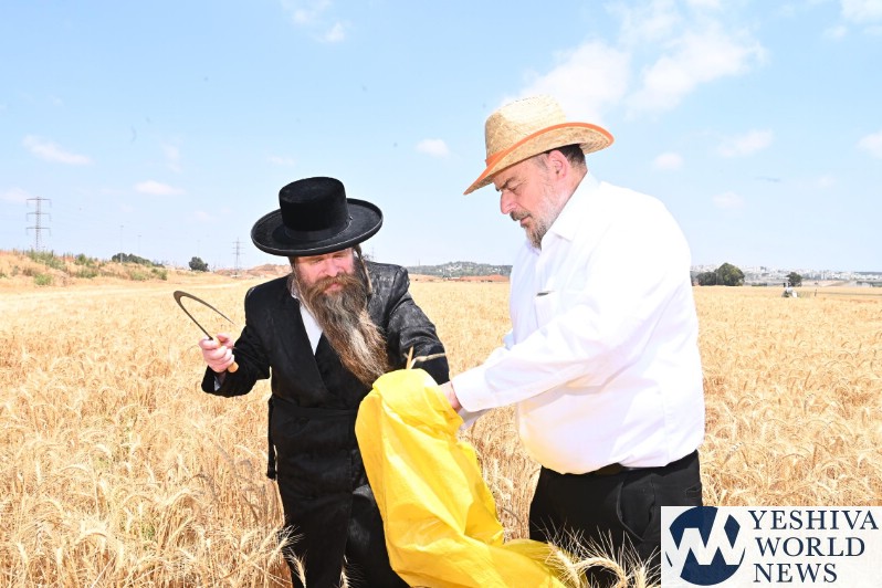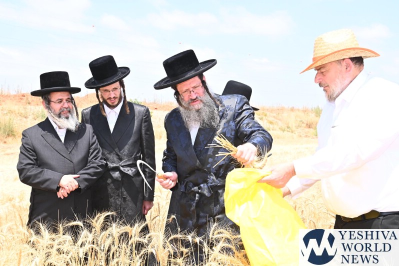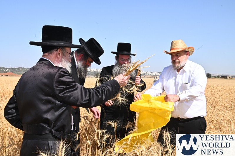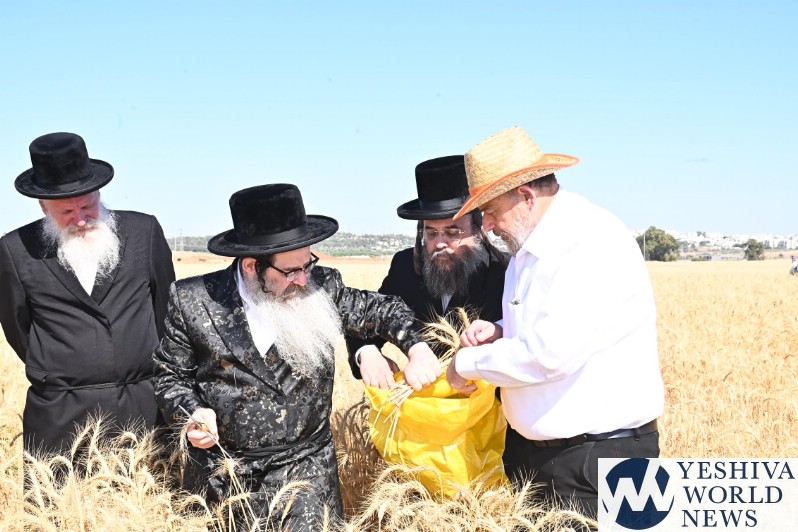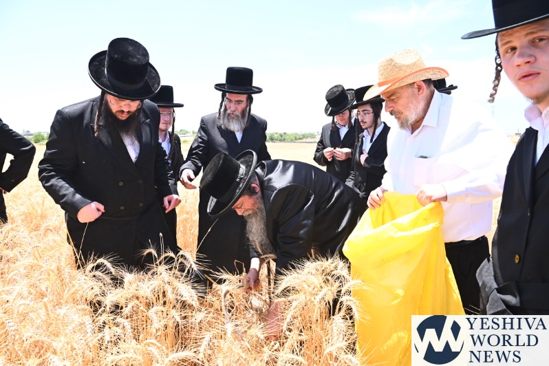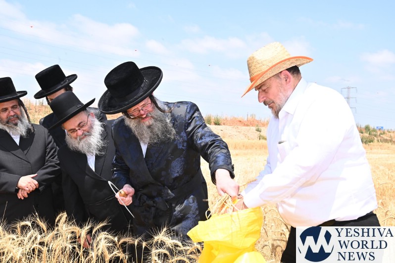 Prominent Gedolei Yisrael, led by Rosh Yeshiva HaGaon HaRav Berel Povarsky, HaGaon HaRav Shimon Galai, HaGaon HaRav Shmuel Eliezer Stern, and the Admorim from Shevet HaLevi, Sasov, Shomrei Emunim, Bitchkov, Nadvorna Elad, Meilin, and others, went to the fields to harvest wheat for the renowned Tiferes Matzos Bakery, owned by the esteemed askan Reb Aharon Yosef Kornitzer.