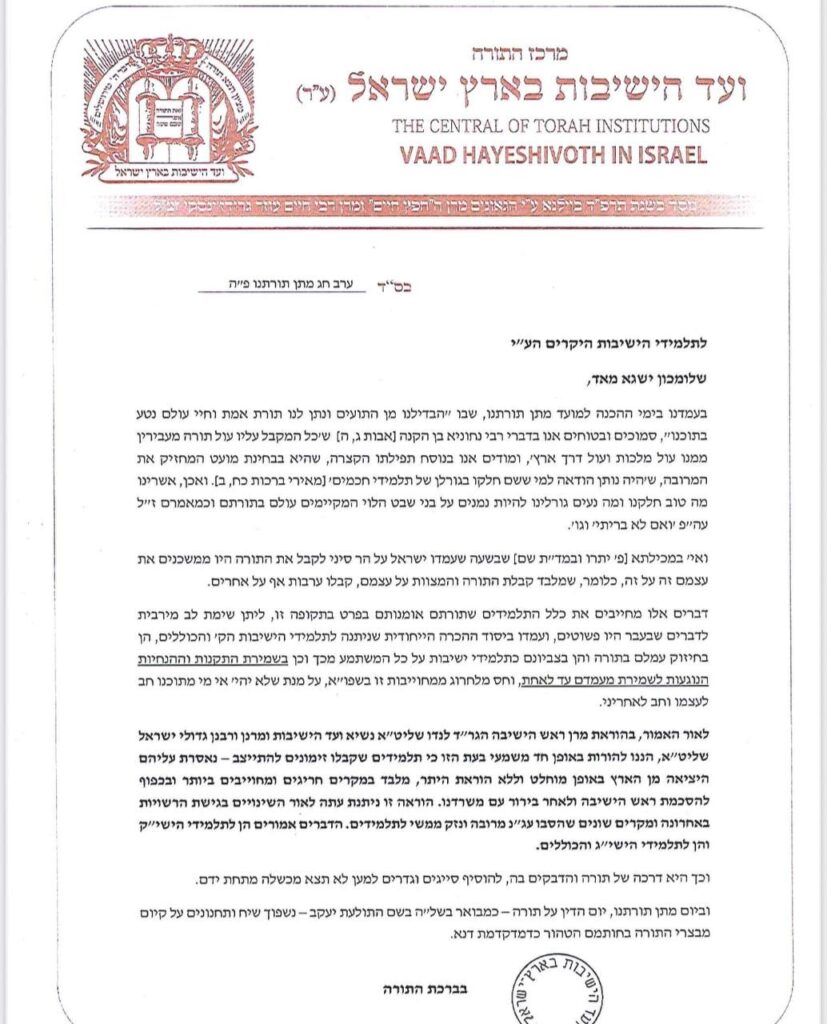 The letter states, “At the instruction of the Rosh Yeshiva, HaGaon HaRav Dov Landau, Nasi of the Va’ad HaYeshivos and Maranan Verabanan Gedolei Yisrael, we hereby instruct – absolutely and without any exceptions – that talmidim who received draft orders are forbidden from leaving the country, except in extremely rare and necessary cases and subject to the approval of the Rosh Yeshiva and after clarification with our office.”