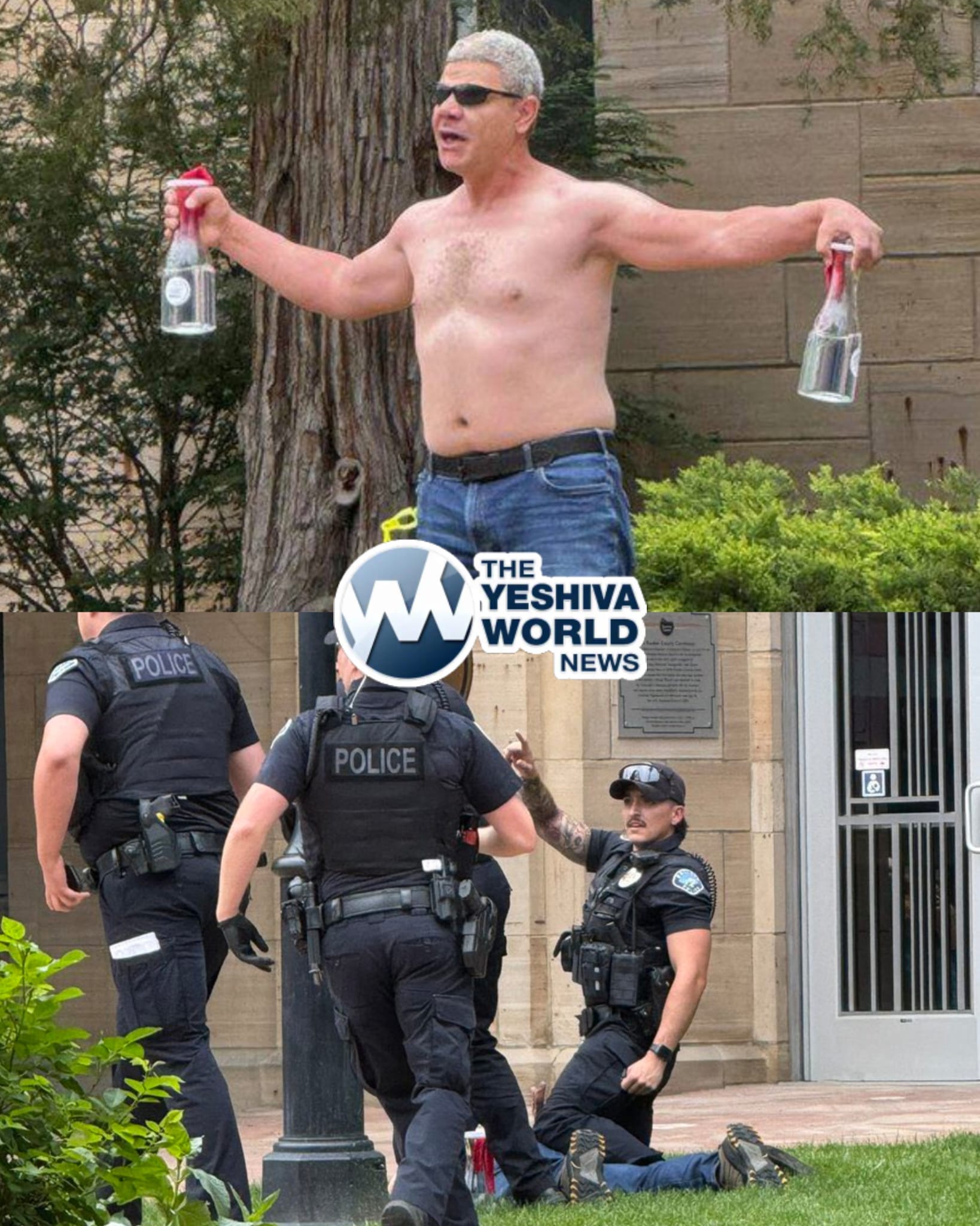 During the attack, one of the Molotov cocktails caused the terrorist’s shirt to set on fire. He removed his shirt and a bulletproof vest, and then police, who had been called to the scene, arrested him. He did not resist the arrest.