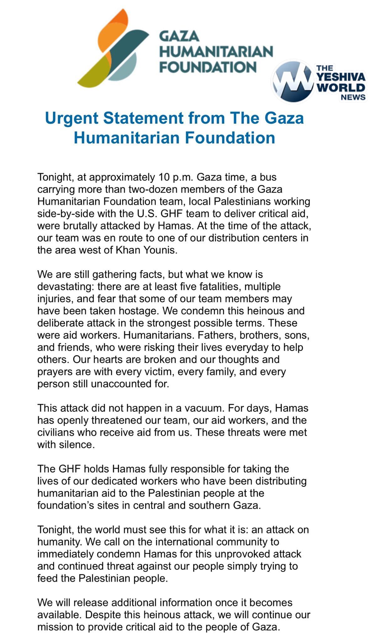 “This attack did not happen in a vacuum,” GHF said in its statement, revealing that Hamas had issued repeated threats to GHF staff and local civilians involved in its aid distribution network.