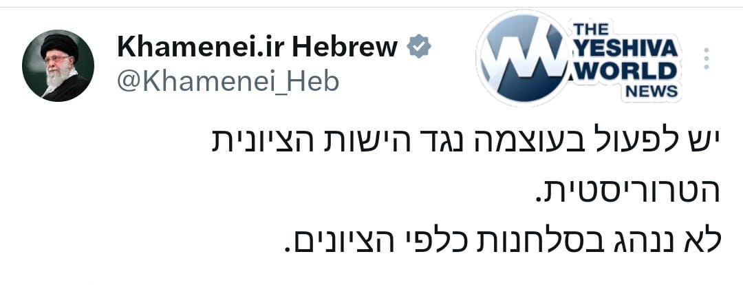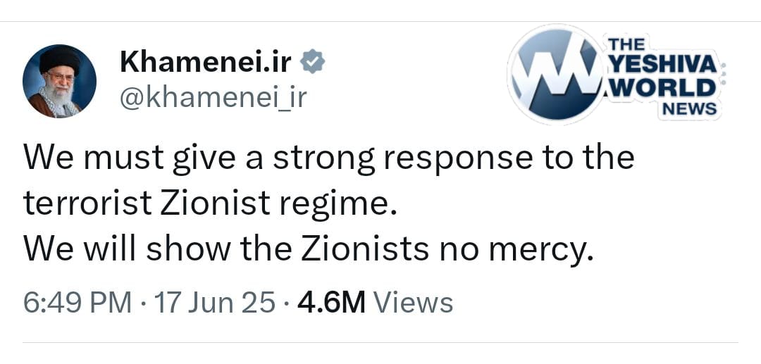 At 4:30 a.m. local time, Khamenei took to X with his latest outburst—this time in Hebrew: “We must act with force against the terrorist Zionist entity… We will not be merciful toward the Zionists.”