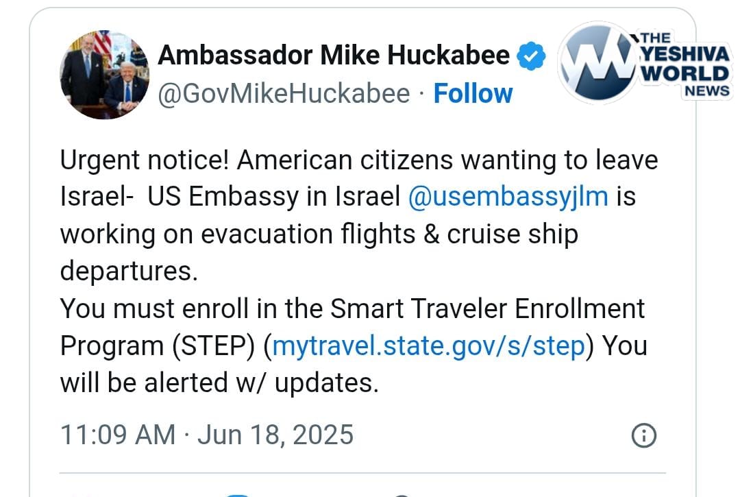 “Urgent notice! American citizens wanting to leave Israel–The U.S. Embassy in Israel is working on evacuation flights & cruise ship departures. You must enroll in the Smart Traveler Enrollment Program (STEP) You will be alerted w/ updates,” he wrote, providing a link to the program.