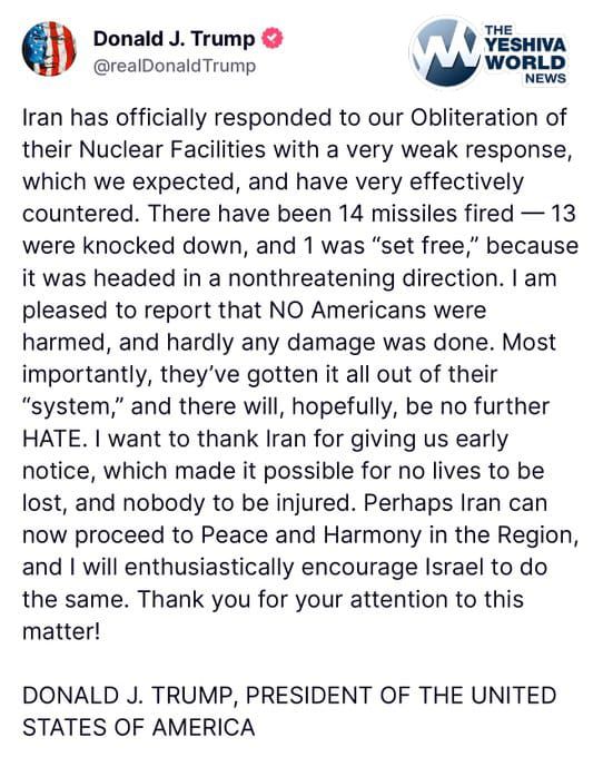“Perhaps Iran can now proceed to Peace and Harmony in the Region, and I will enthusiastically encourage Israel to do the same.”