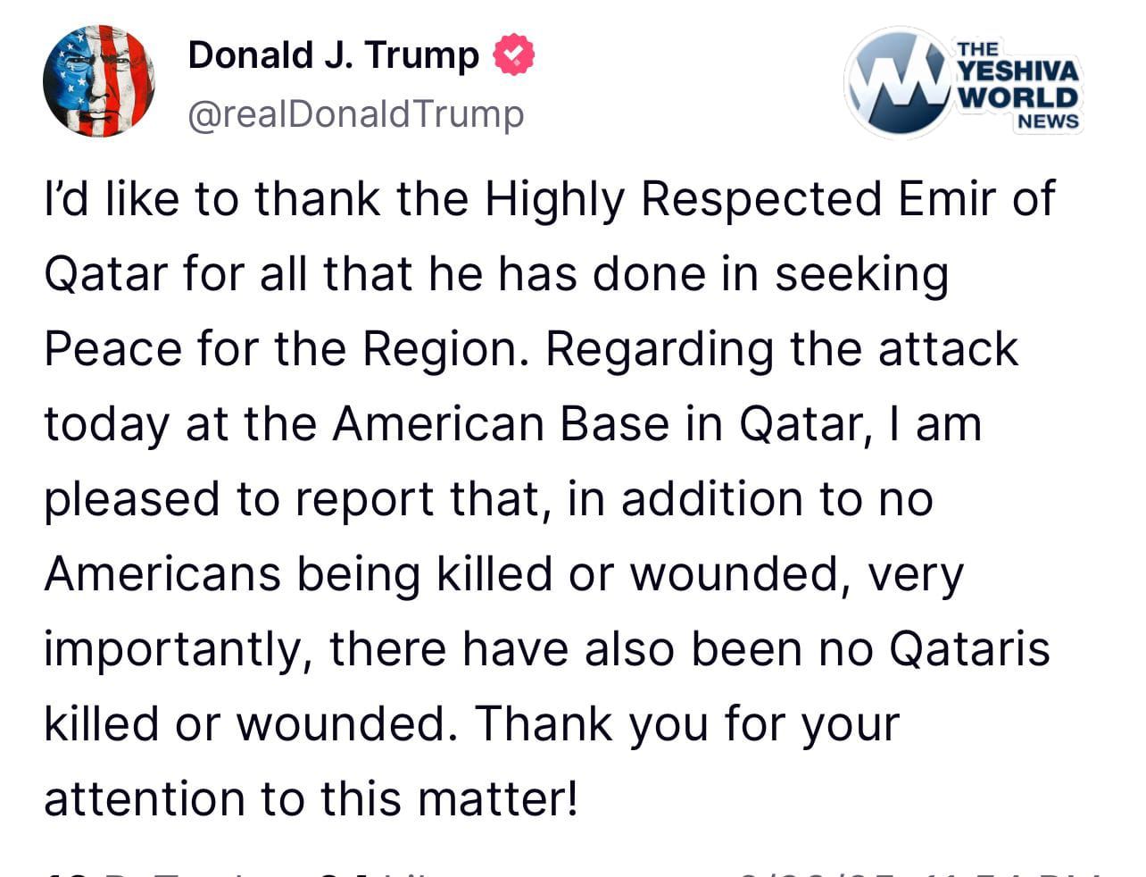 In a follow-up post, Trump thanked the Emir of Qatar, saying, “I’d like to thank the Highly Respected Emir of Qatar for all that he has done in seeking Peace for the Region. Regarding the attack today at the American Base in Qatar, I am pleased to report that, in addition to no Americans being killed or wounded, very importantly, there have also been no Qataris killed or wounded. Thank you for your attention to this matter.”