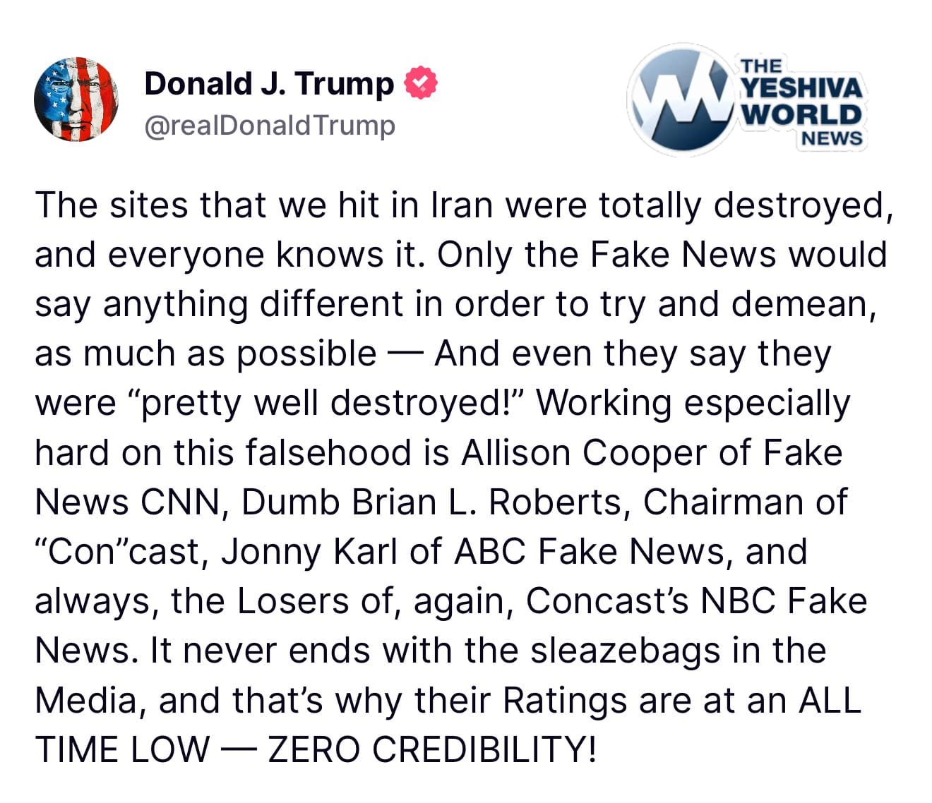 “The sites we hit in Iran were totally destroyed, and everyone knows it,” Trump posted on Truth Social. “Only the Fake News would say anything different in order to try and demean, as much as possible – And even they say they were ‘pretty well destroyed!’”