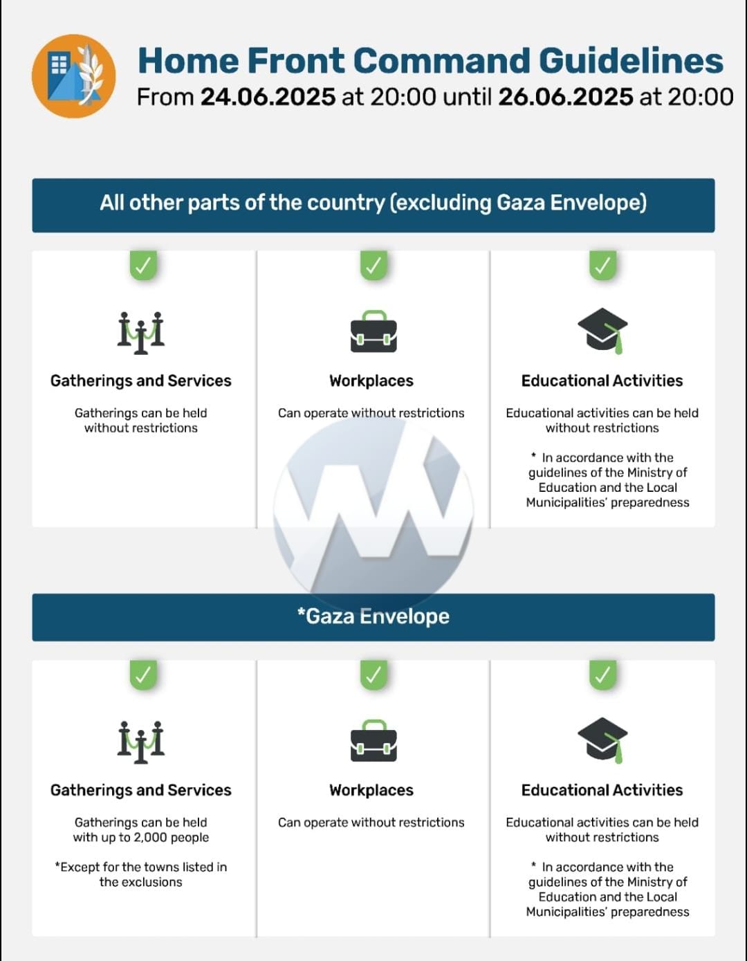According to the official statement, the Home Front Command’s updated defensive guidelines will take effect Tuesday, June 24th, at 8:00 PM, and remain in place until Thursday, June 26th at 8:00 PM.