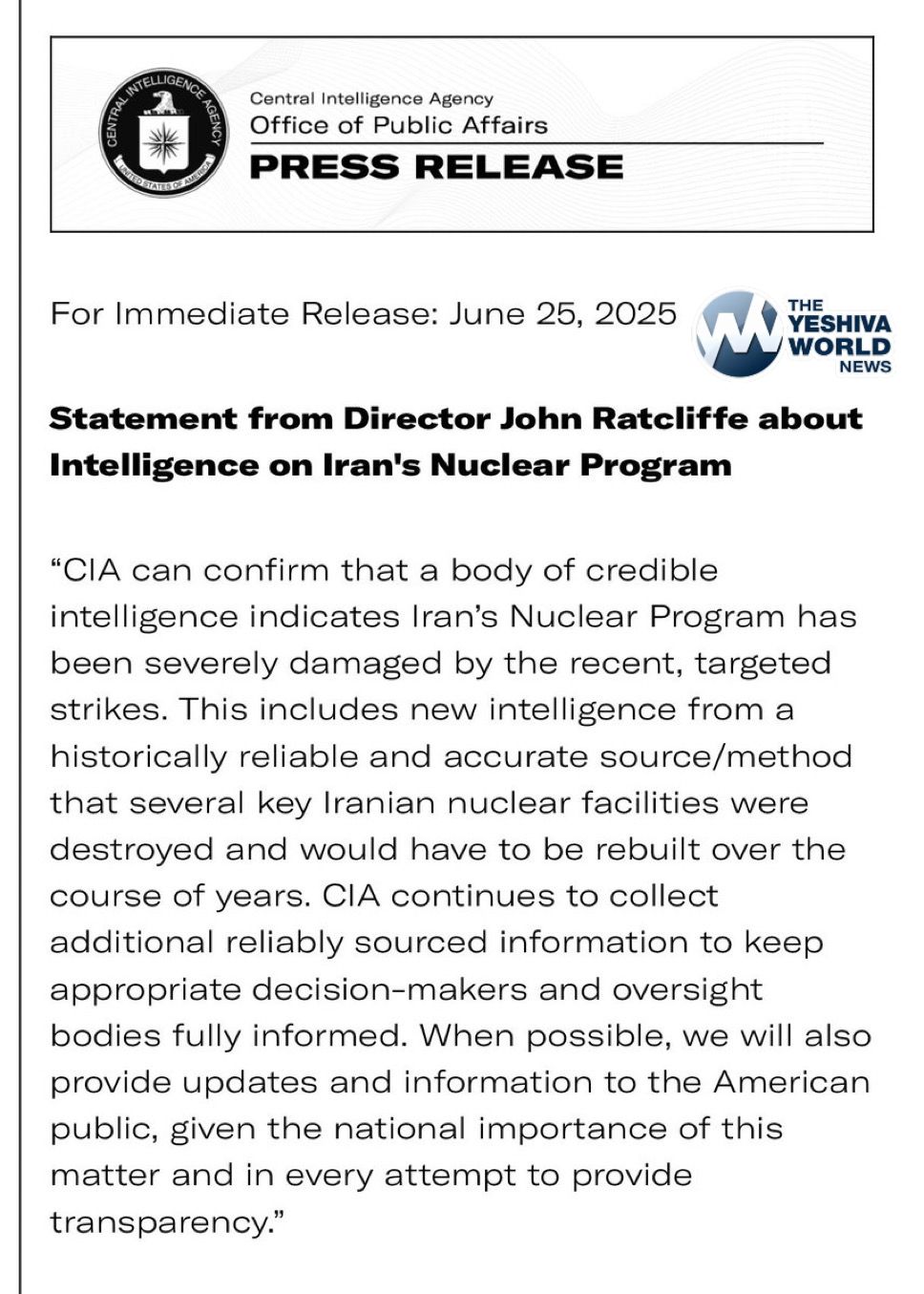 In a statement posted to X, Ratcliffe said the CIA has credible intelligence—including from a trusted source—that key Iranian nuclear facilities were destroyed and will take years to rebuild.