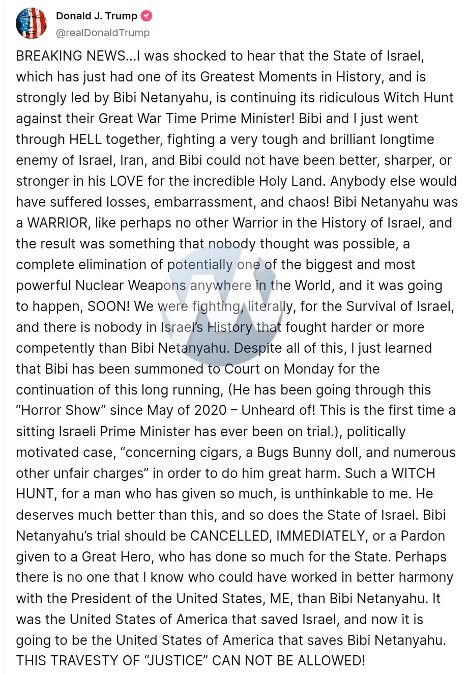“It was the United States of America that saved Israel,” Trump continued. “And now it is going to be the United States of America that saves Bibi Netanyahu. THIS TRAVESTY OF ‘JUSTICE’ CAN NOT BE ALLOWED!”
