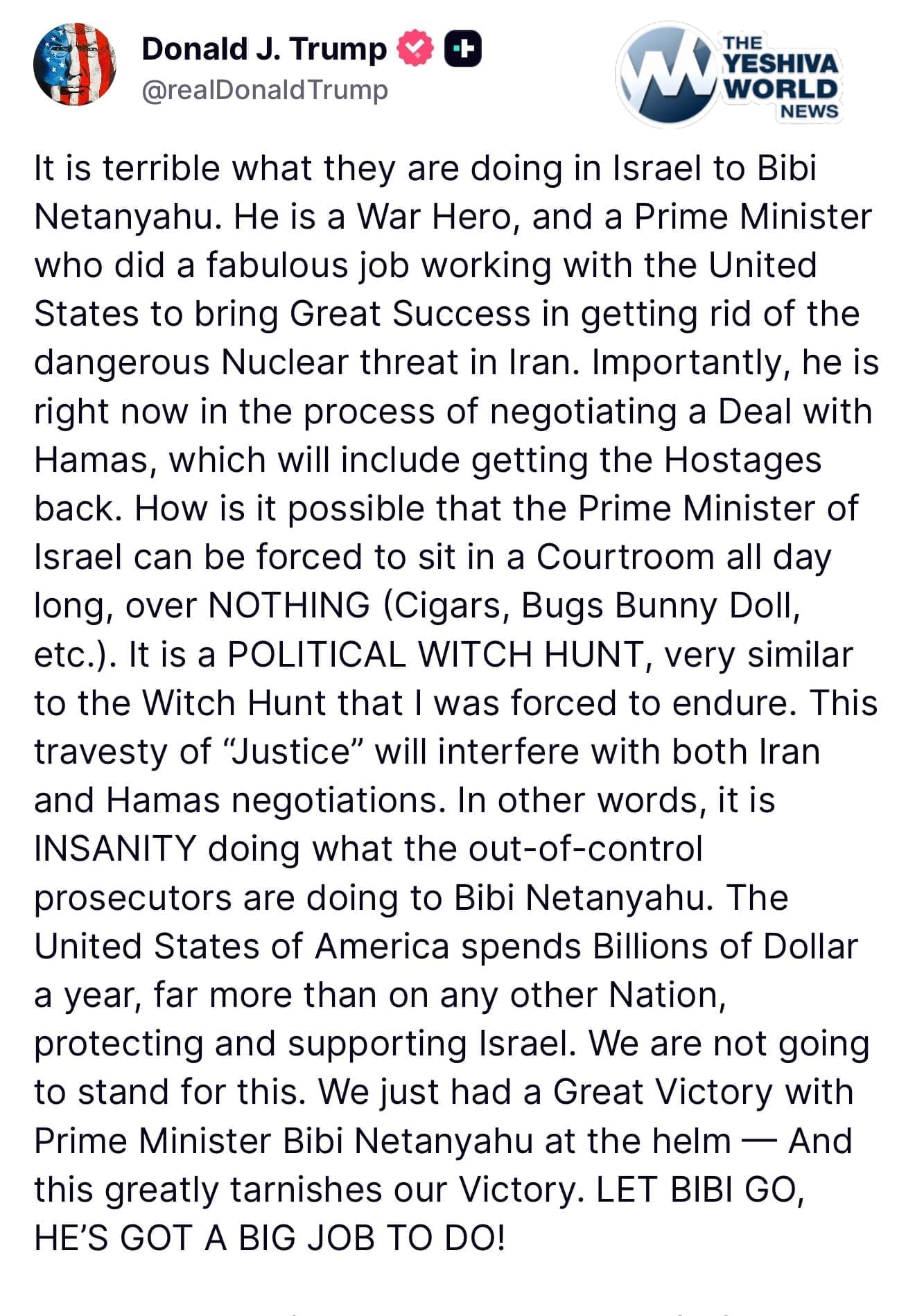 “It is terrible what they are doing in Israel to Bibi Netanyahu,” Trump writes on Truth Social.