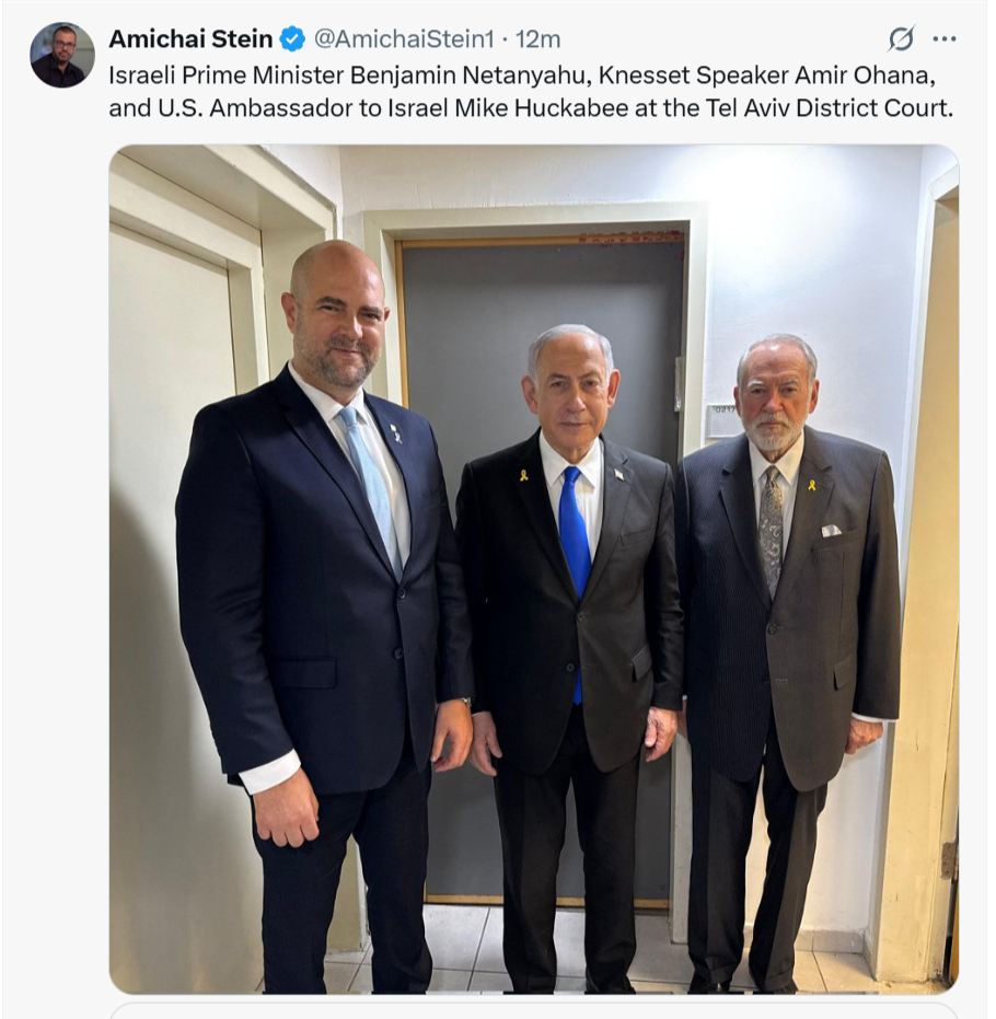 Huckabee’s appearance was not the only interruption to the trial on Wednesday. Earlier, Netanyahu’s testimony was suspended after his military secretary, Maj. Gen. Roman Gofman, arrived at the court and transferred a note to the prime minister. Immediately afterward, Netanyahu asked the judge for a break to discuss an urgent security issue. The judges granted his request, and Netanyahu left the court for about 20 minutes.