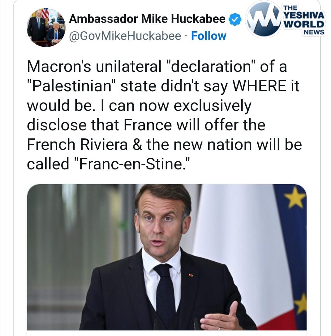 The sarcasm didn’t stop there. In a follow-up post dripping with mockery, Huckabee took aim at the lack of geographical specificity in Macron’s plan. “Macron’s unilateral ‘declaration’ of a ‘Palestinian’ state didn’t say WHERE it would be,” he wrote. “I can now exclusively disclose that France will offer the French Riviera, & the new nation will be called ‘Franc-en-Stine.’”