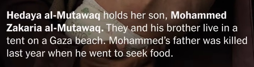 Additionally, media outlets (such as the example below from NYT) emphasized the “famine” narrative by falsely reporting that Mohammed has no father because he was killed by the Israelis while “looking for food.”