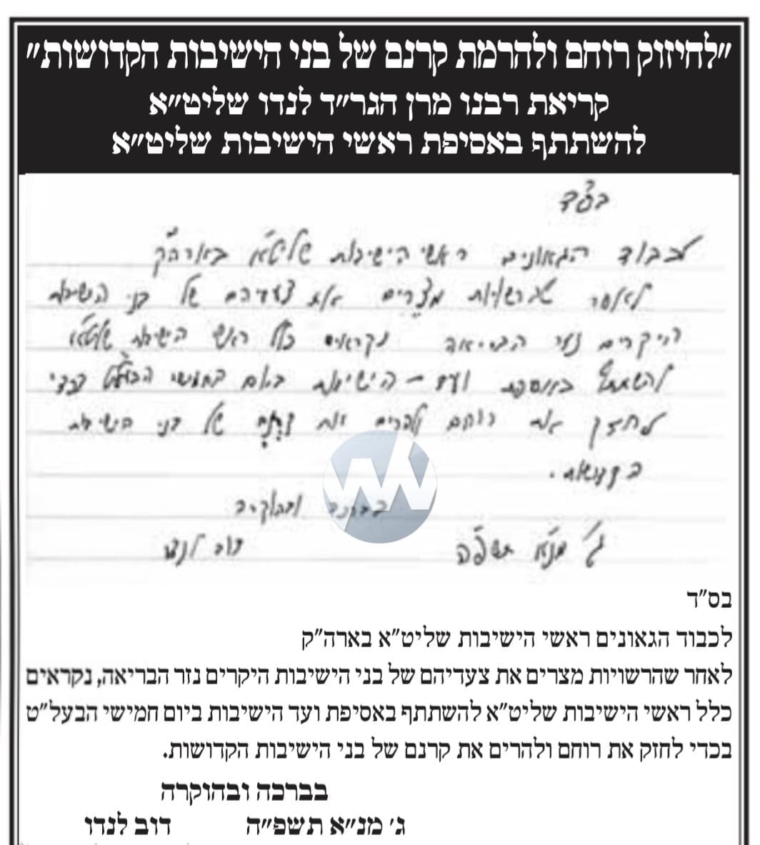 In light of the increasing threats to the status of bnei yeshivos, HaGaon HaRav Dov Landau on Monday instructed the chairman of the Va’ad Hayeshivos, HaRav Chaim Aharon Kaufman, to convene a special emergency meeting for all Roshei Yeshivos across the country.