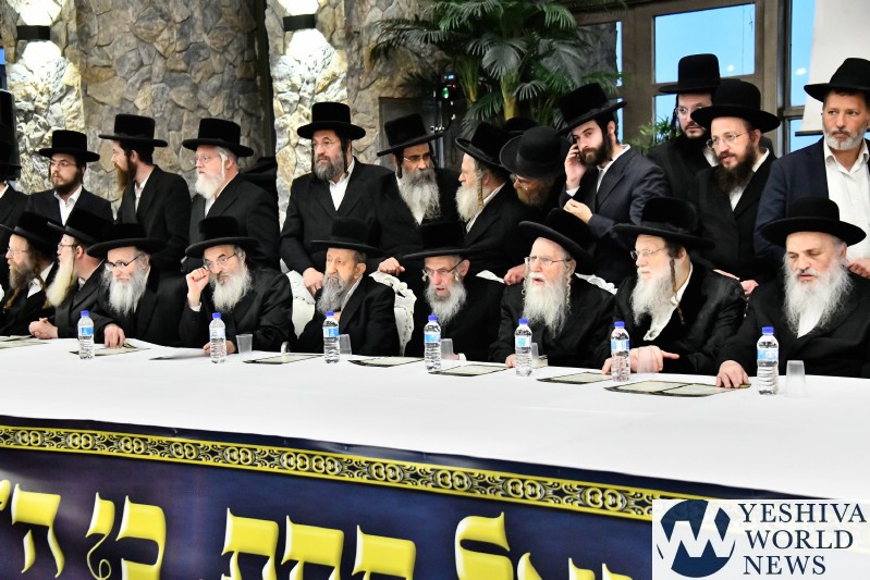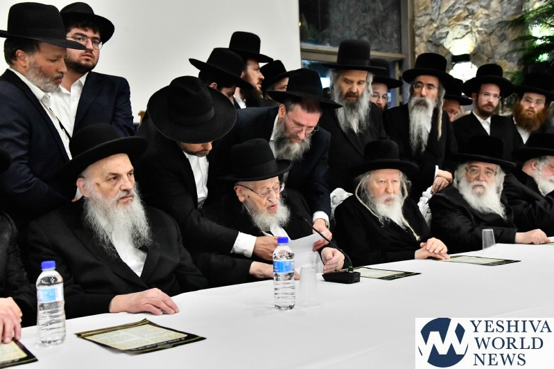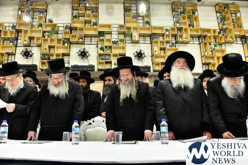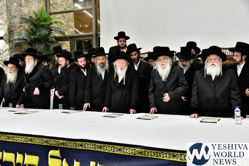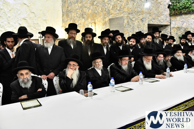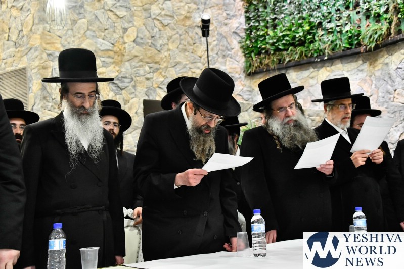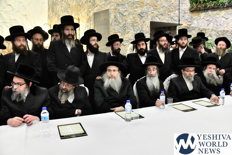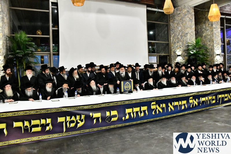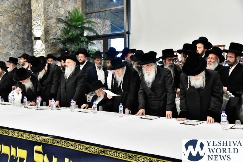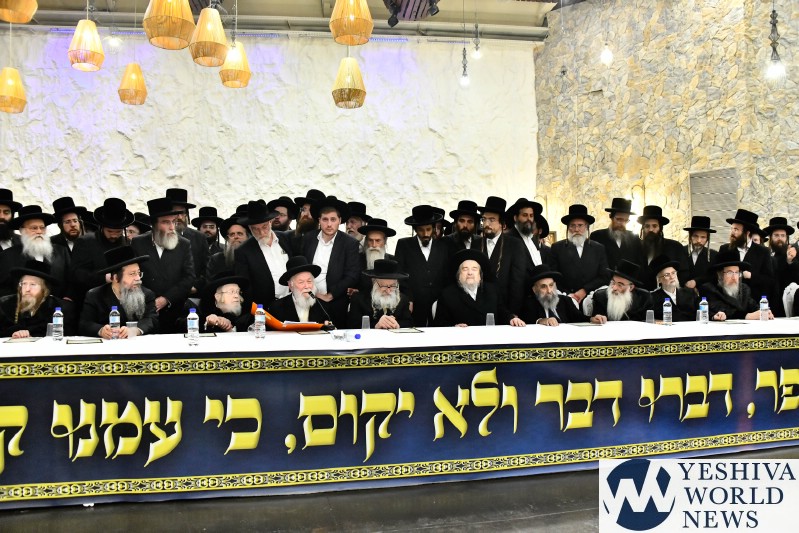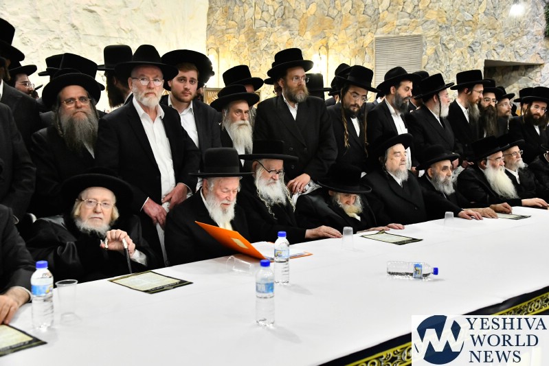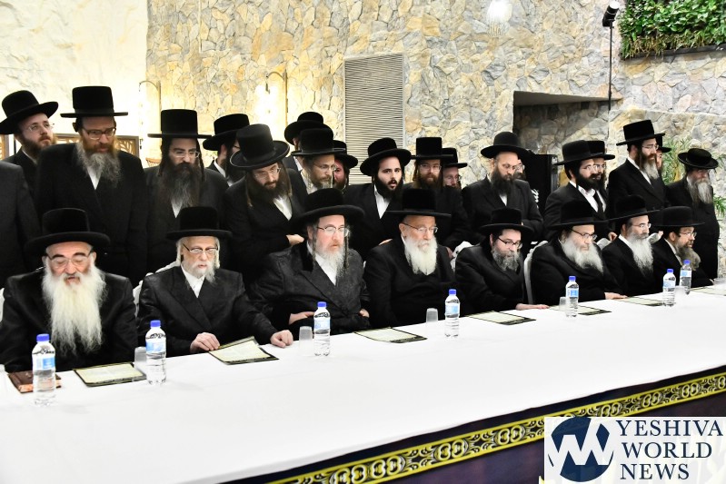 Attendees included the Rebbes of Ger, Vizhnitz, Sanz, Chernobyl, Mishkenos HaRo’im, Zvil, Skulen, Machnovka-Belz, and representatives of Skver, Bohush, Nadvorna, Modzitz, Rahmastrivka, Dorg, Tolna, Strikov, Harav Yaakov Meir Shechter of Breslov, Mashpia HaRav Biderman, and others. They were joined by Litvish roshei yeshiva and poskim, including Harav Moshe Tzadka, Harav Meir Tzvi Bergman, Harav Chaim Feinstein, Harav Yitzchok Zilberstein, Harav Moshe Brozovsky, and others.