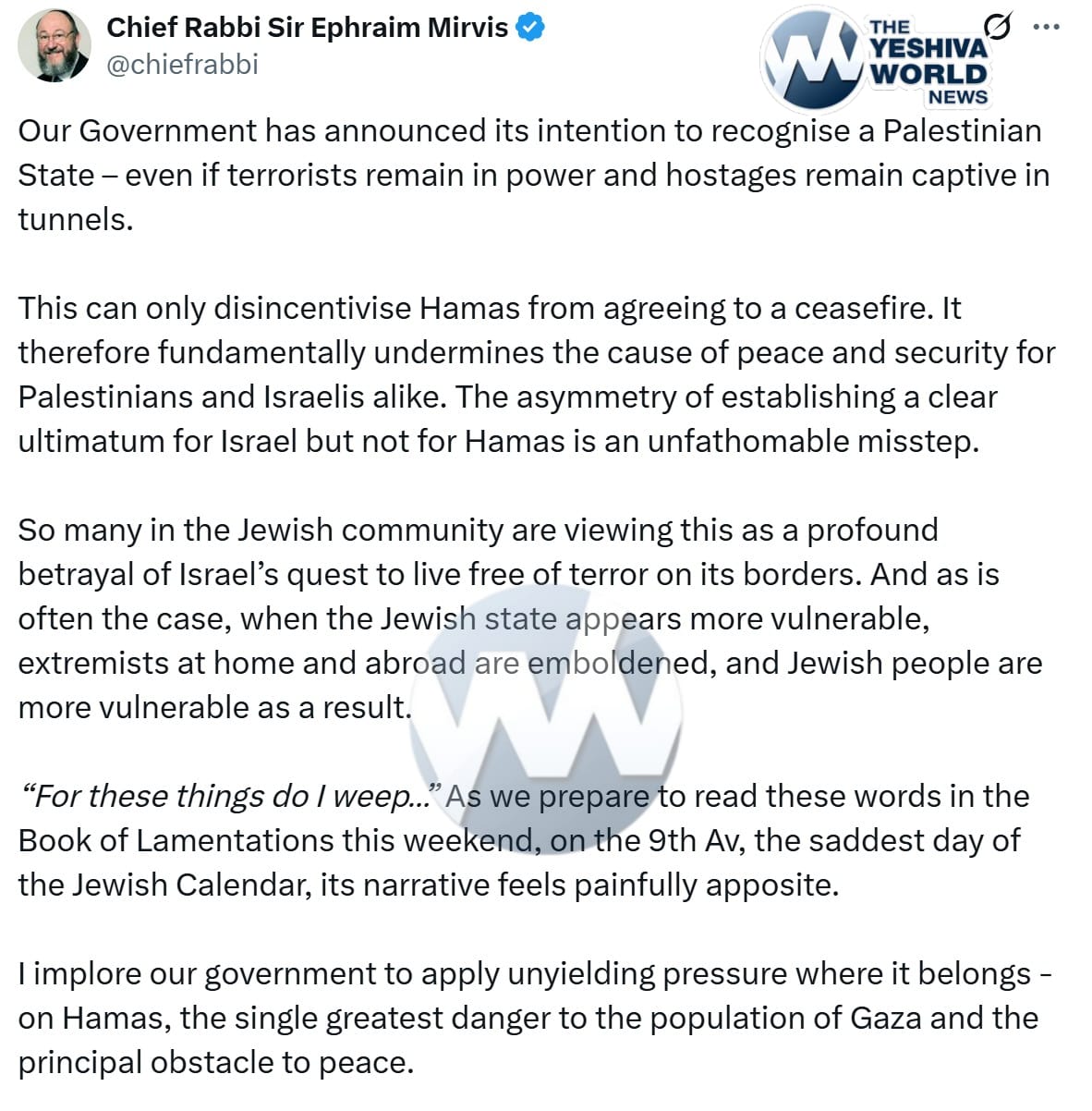 “Our Government has announced its intention to recognise a Palestinian State – even if terrorists remain in power and hostages remain captive in tunnels,” Rabbi Mirvis wrote. “This can only disincentivise Hamas from agreeing to a ceasefire. It therefore fundamentally undermines the cause of peace and security for Palestinians and Israelis alike.”